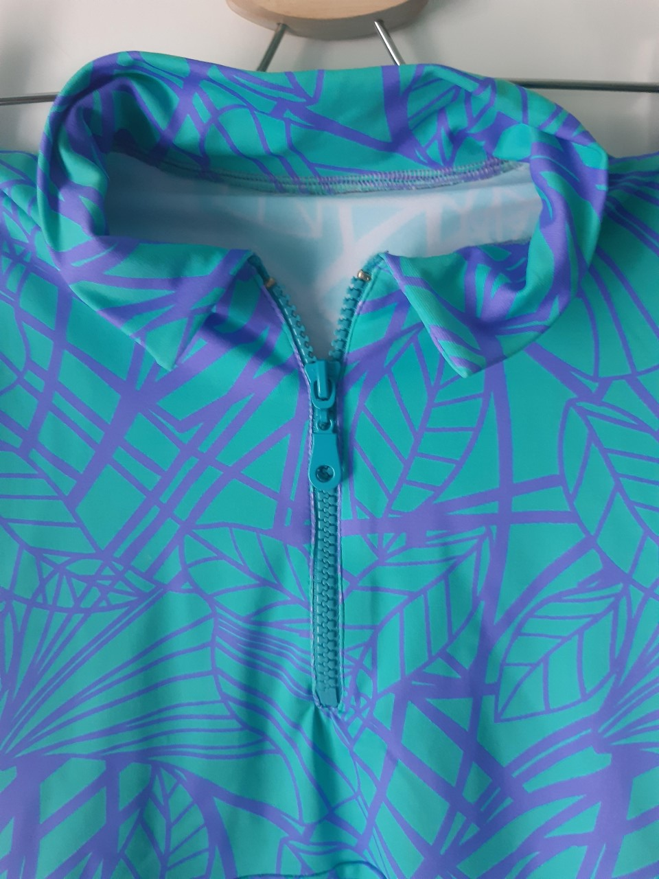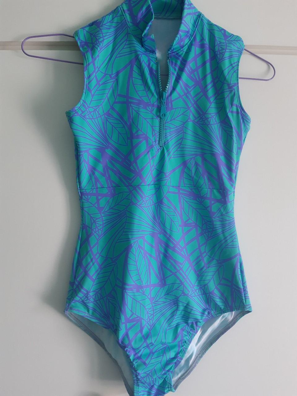 Dieser Turnanzug besteht aus hochwertigem Lycra mit einem Marmormuster in Aquagrün und Violett (genau wie das Wasser des Miami Bachs!!) und verfügt über einen hübschen lila Frontreißverschluss.