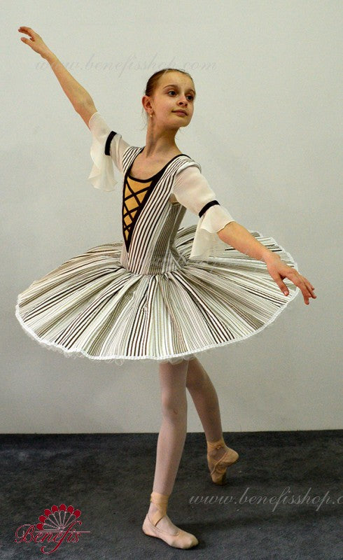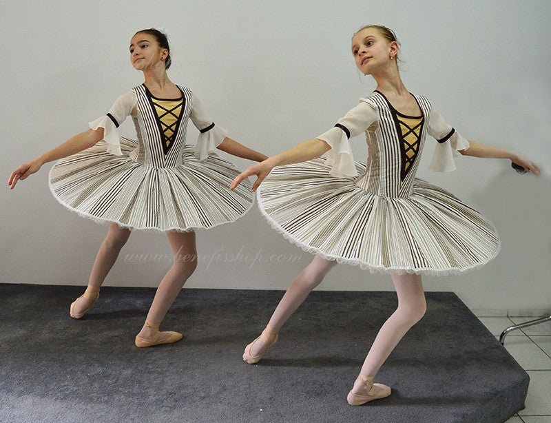 Grundlegende Details: Dies ist ein professionelles Ballett-Bühnenkostüm, das auf der Grundlage eines Mieders mit Schulternähten mit einer kleinen Kappe auf der Brust und Ärmeln aus Mesh hergestellt ist.