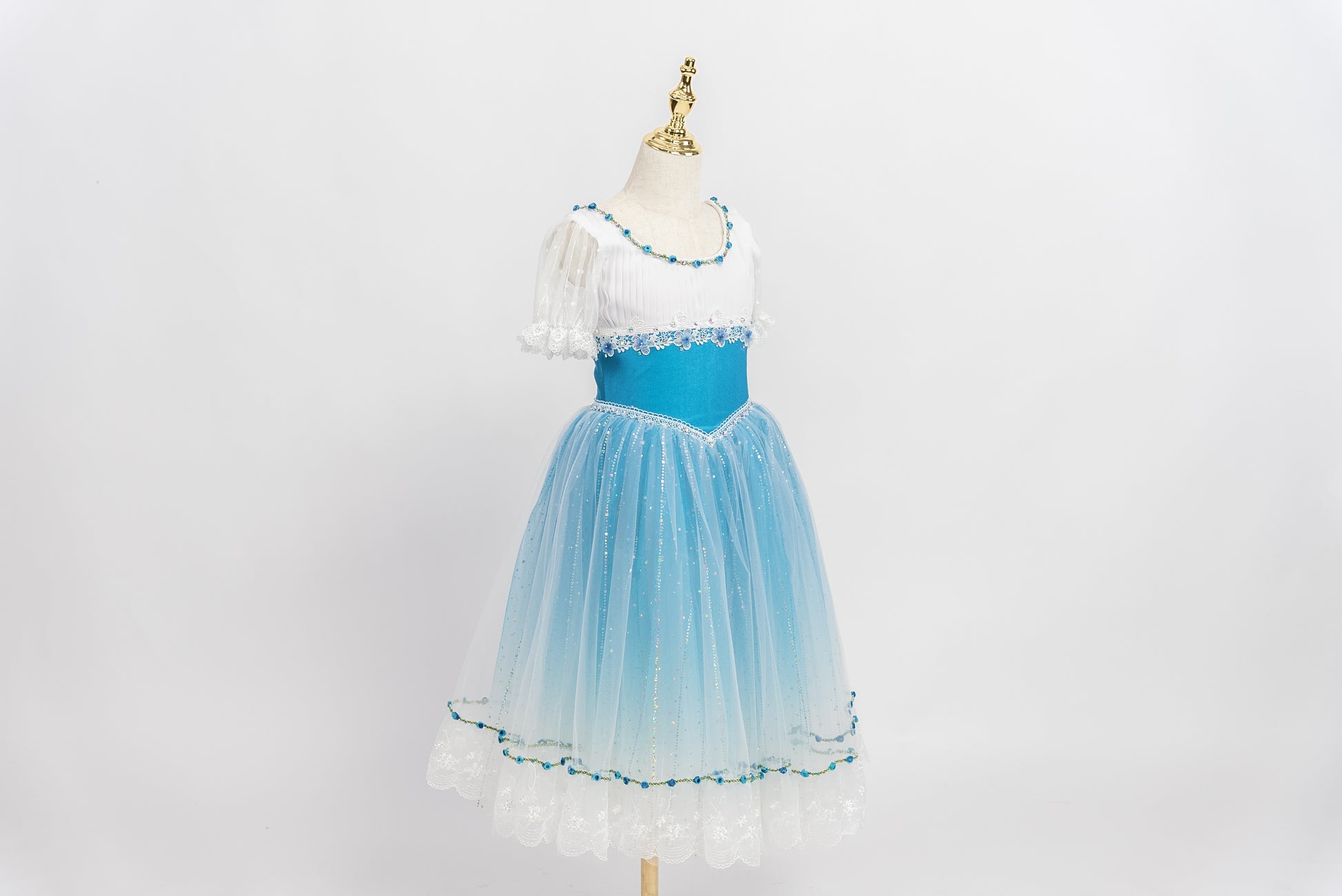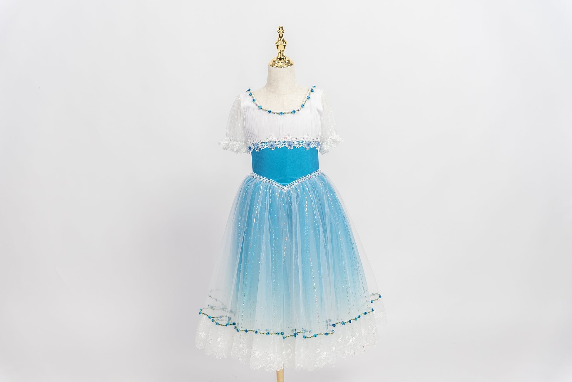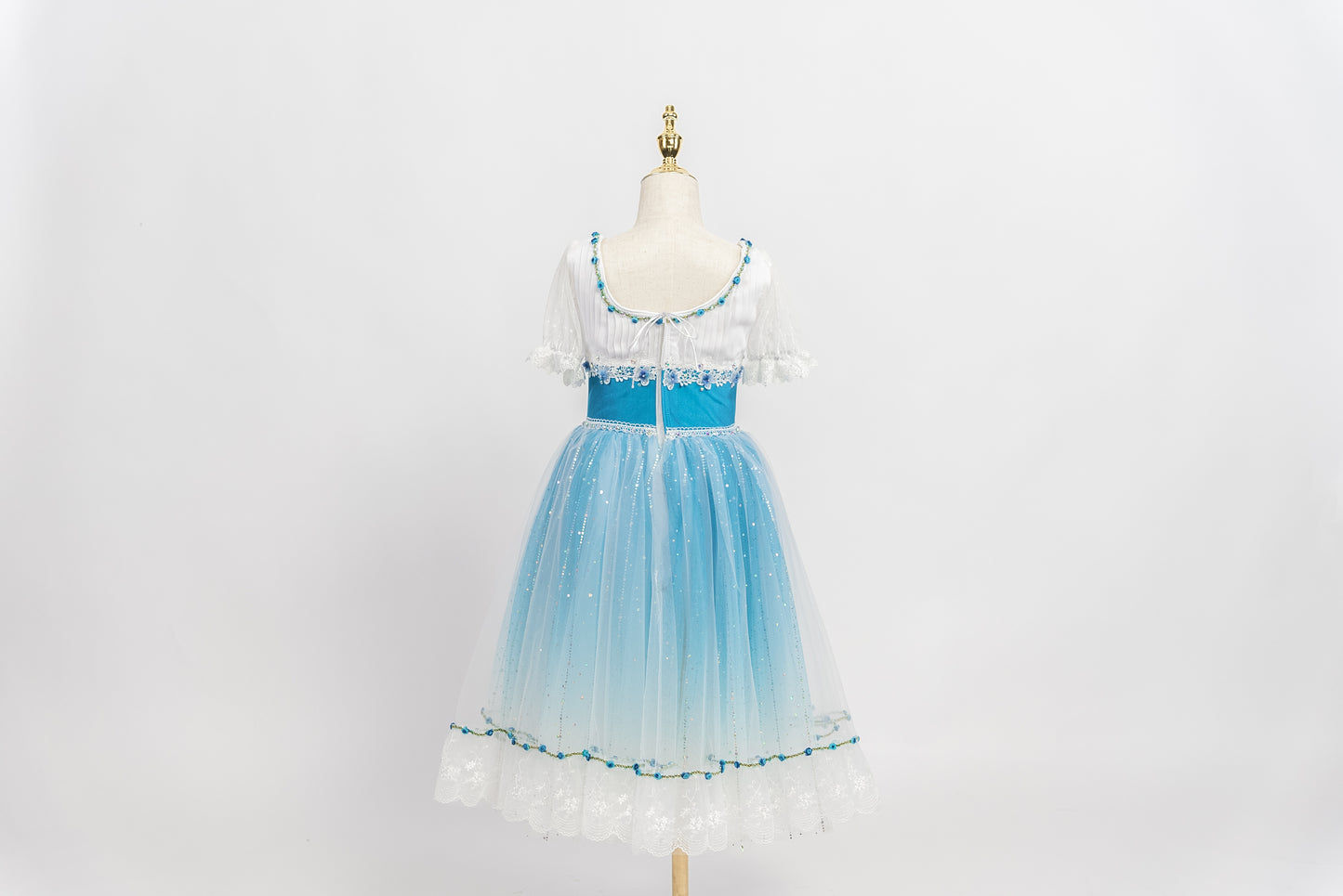Der romantische Tüllrock ist in Blautönen abgestuft und mit einer Lage glitzernden weißen Tülls überzogen. Die Ränder des Tutu-Rocks sind mit Blumenapplikationen und weißer Spitze verziert.