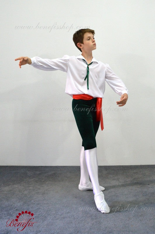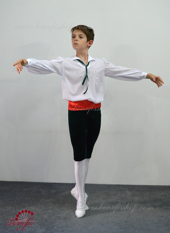 Das Kostüm beinhaltet: weißes Hemd, schwarze Shorts, roten Gürtel, Schal.
