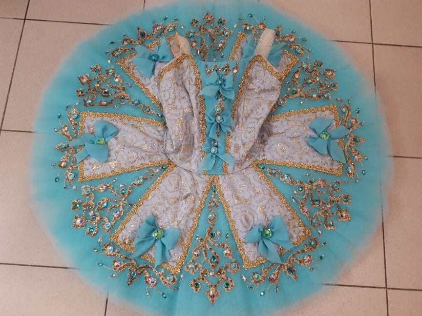 Das professionelle, 10-lagige russische Pancake-Tutu ist aus zwei Farbtönen von hochwertigem Tüll in Aquamarin/Türkis gefertigt. Die oberste Lage des Tutu-Rocks ist mit einem geometrischen Muster verziert, wobei der gleiche Stoff wie beim Oberteil, türkisfarbene Schleifen, goldene Applikationen, Borten und Kristalle verwendet werden.