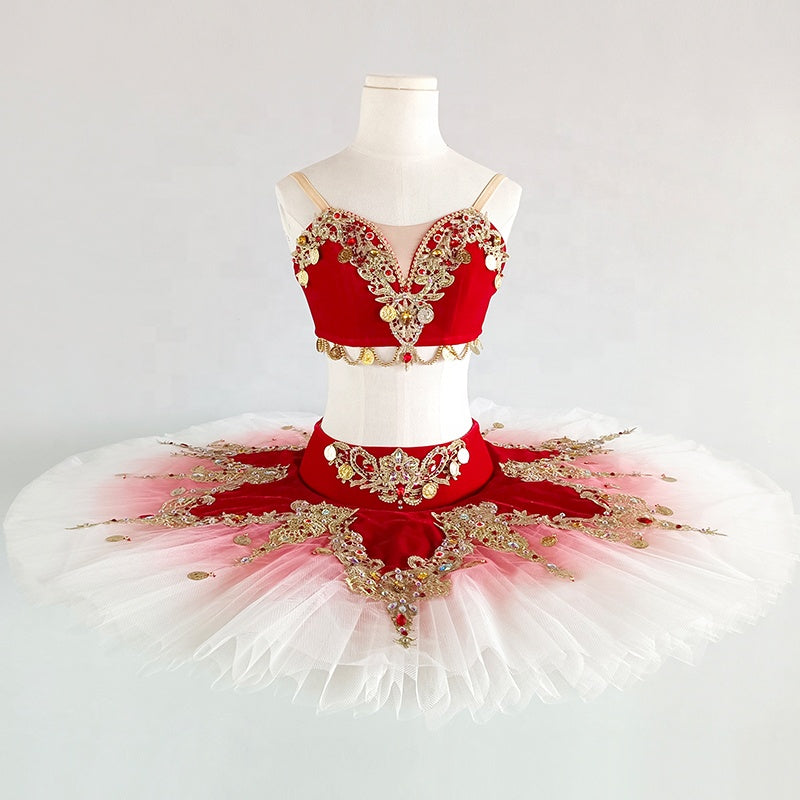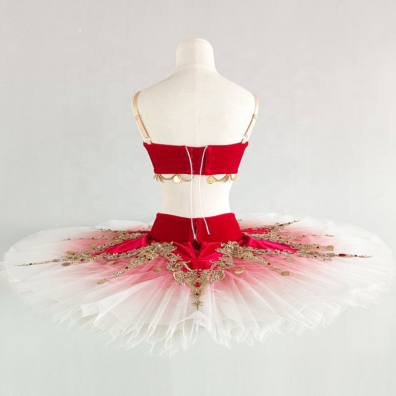 Der professionelle, zehnlagige Pfannkuchen-Tutu-Rock ist mit der Ombre-Technik gefärbt, beginnend in Dunkelrot und zu den Rändern hin in Weiß übergehend. Der Tutu-Rock und das Mieder sind mit einem passenden roten Tutu-Rock verziert, der mit goldenen Applikationen verziert ist.