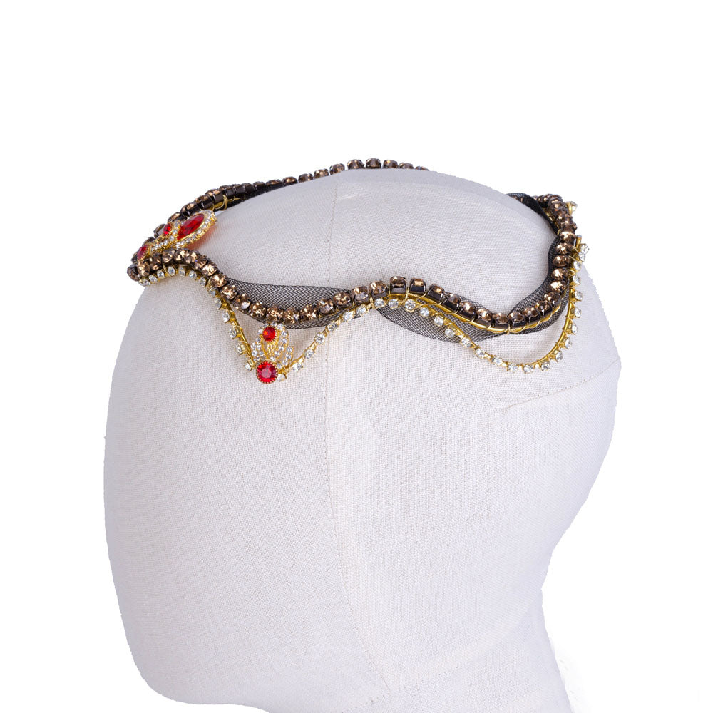 Ein einzigartiger handgefertigter Kopfschmuck, der für viele Ballette geeignet ist, insbesondere für Le Corsaire, La Bayadère und andere. Der Rahmen ist golden und mit großen Kristallen in verschiedenen Farben verziert. Der vordere Teil des Kopfschmucks ist in der Mitte durch einen größeren Stein geteilt und weist einen dramatischen vorderen Tropfen auf.