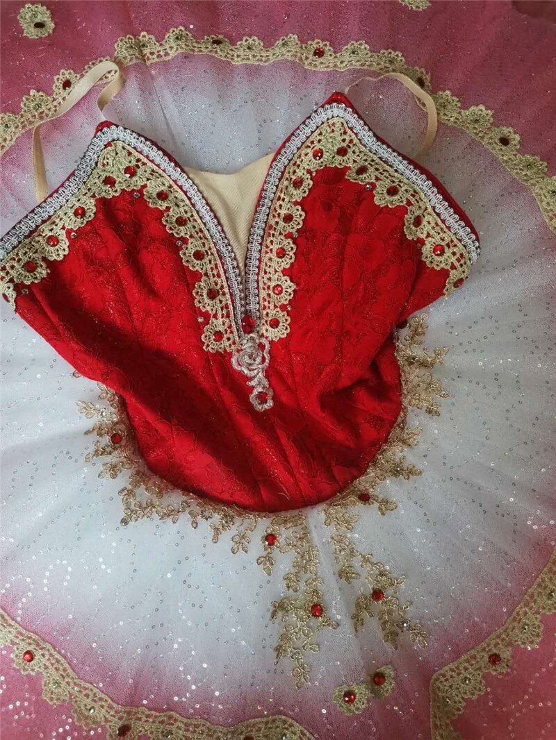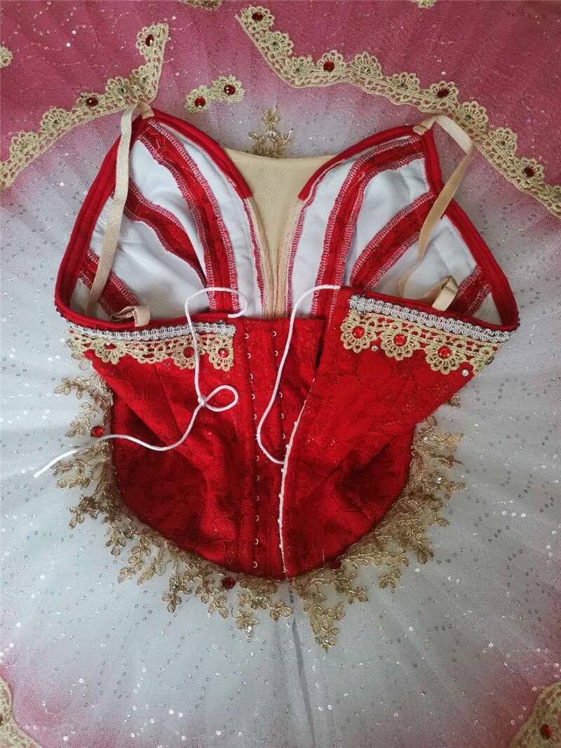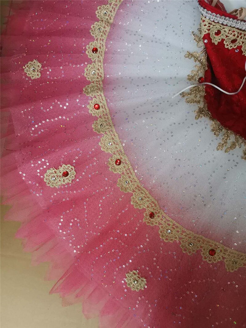 Dieses professionelle Bühnenkostüm besticht durch schöne Ombre-Töne in tiefem Rot, das in Rosa und Weiß übergeht.