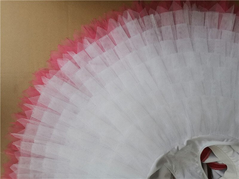 Der Pfannkuchen-Tutu-Rock ist das Highlight dieses Tutus. Er besteht aus 8 Lagen weißem Tüll, während die beiden oberen Lagen in Kirschrosa- und Weißtönen gefärbt sind und Glitzersteine enthalten. Rund um den Rock sind Applikationen und Kristalle aufgenäht.