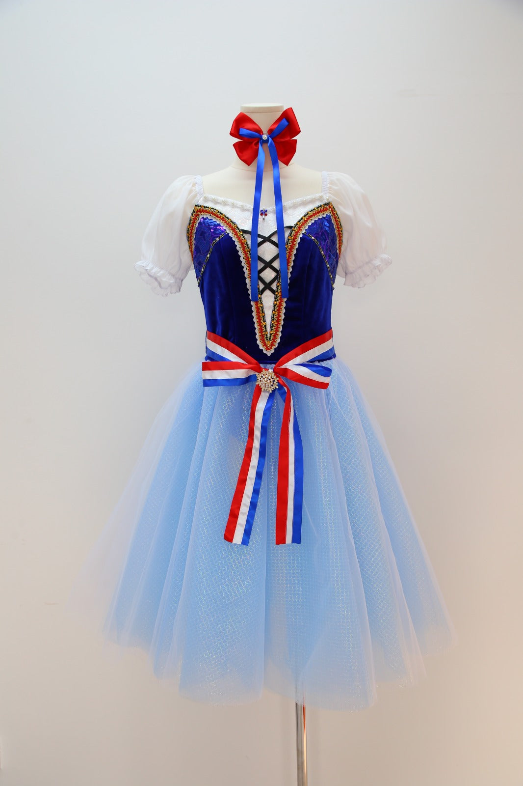Velvet, deep blue bodice, with laced pattern, red and white shiny trims, and white undershirt. Short white chiffon sleeves, hooks and eyes closing and red bow headpiece.