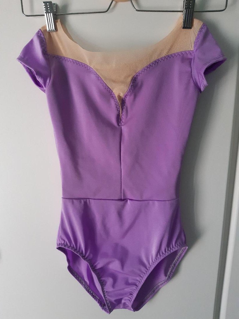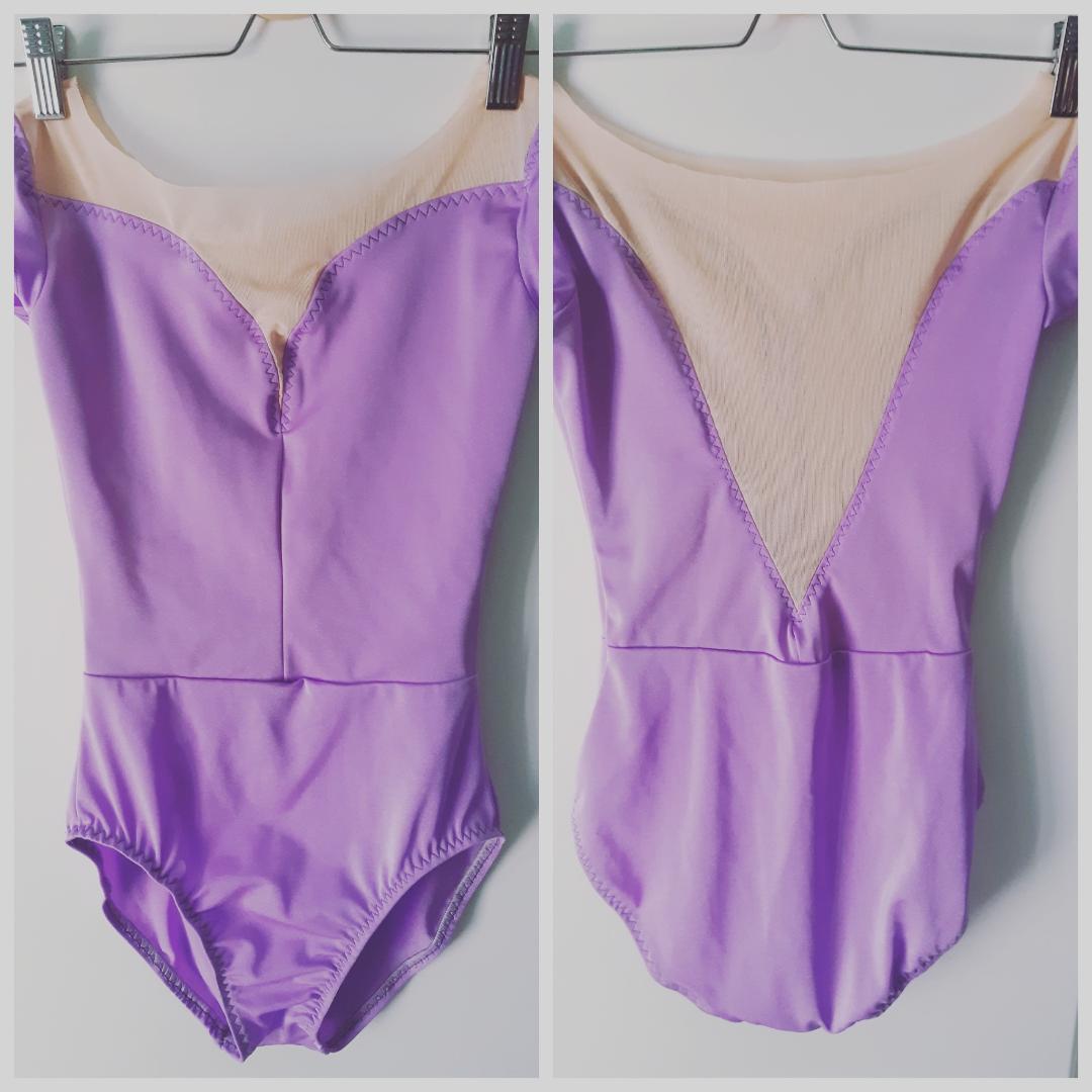 Ein wunderbarer Farbton blasslila Lycra für diesen neu entworfenen Turnanzug von Patricia. Mit schmeichelndem V-Ausschnitt aus nacktem Netzstoff vorne und hinten und kurzen Ärmeln.
