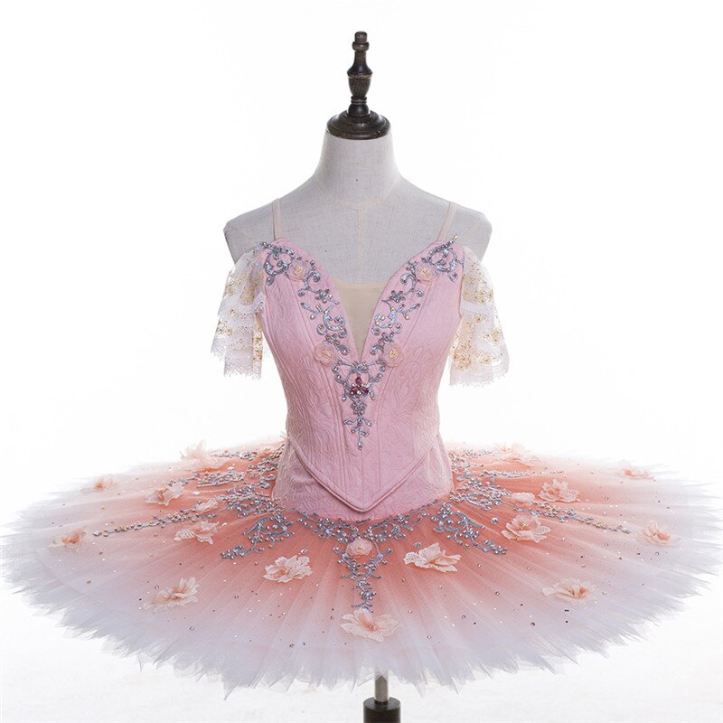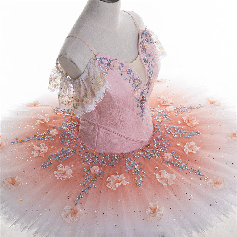 Dieses professionelle Tutu besteht aus professionellem rosa Brokatstoff und einem V-förmigen Oberteil, das mit silbernen Applikationen und Kristallen verziert ist. Vorne befindet sich ein tiefer V-Ausschnitt mit einem Einsatz aus hautfarbenem Netzstoff. Das Oberteil wird hinten mit einer doppelten Reihe Haken und Ösen befestigt. Die Ärmel bestehen aus weißer und goldener Spitze und sind in der Nähe der transparenten Träger befestigt.