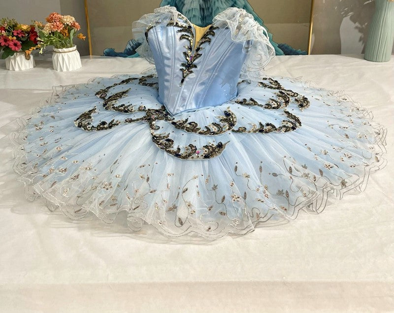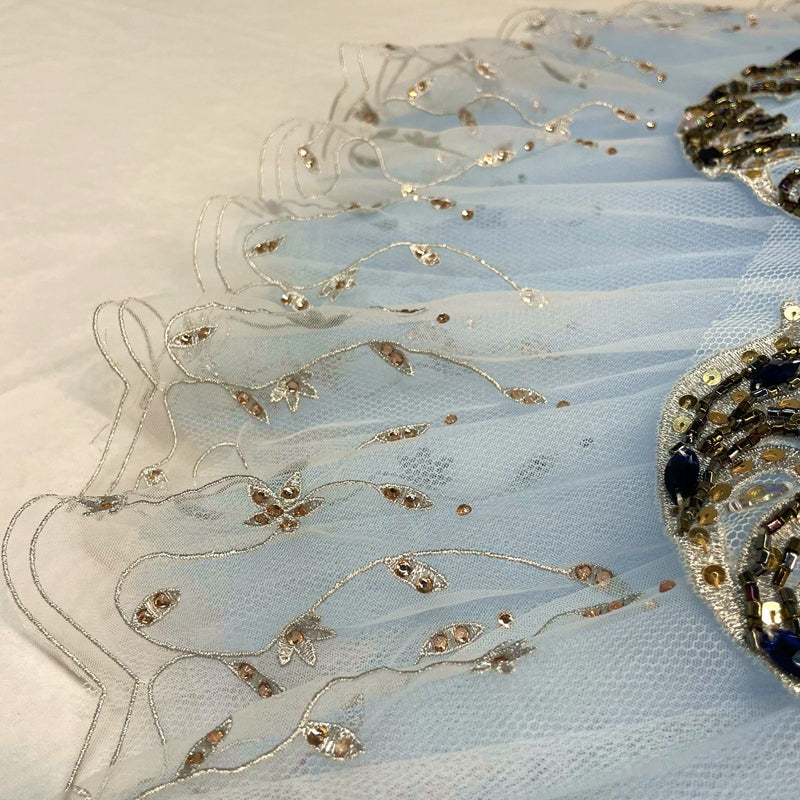 Der professionelle, zehnlagige Tutu-Rock ist ebenfalls hellblau. Passend zum Oberteil ist der Rock sehr reich bestickt. Rund um den Rock sind goldene und schwarze Applikationen, blaue Kristallbesätze und Perlen aufgenäht.