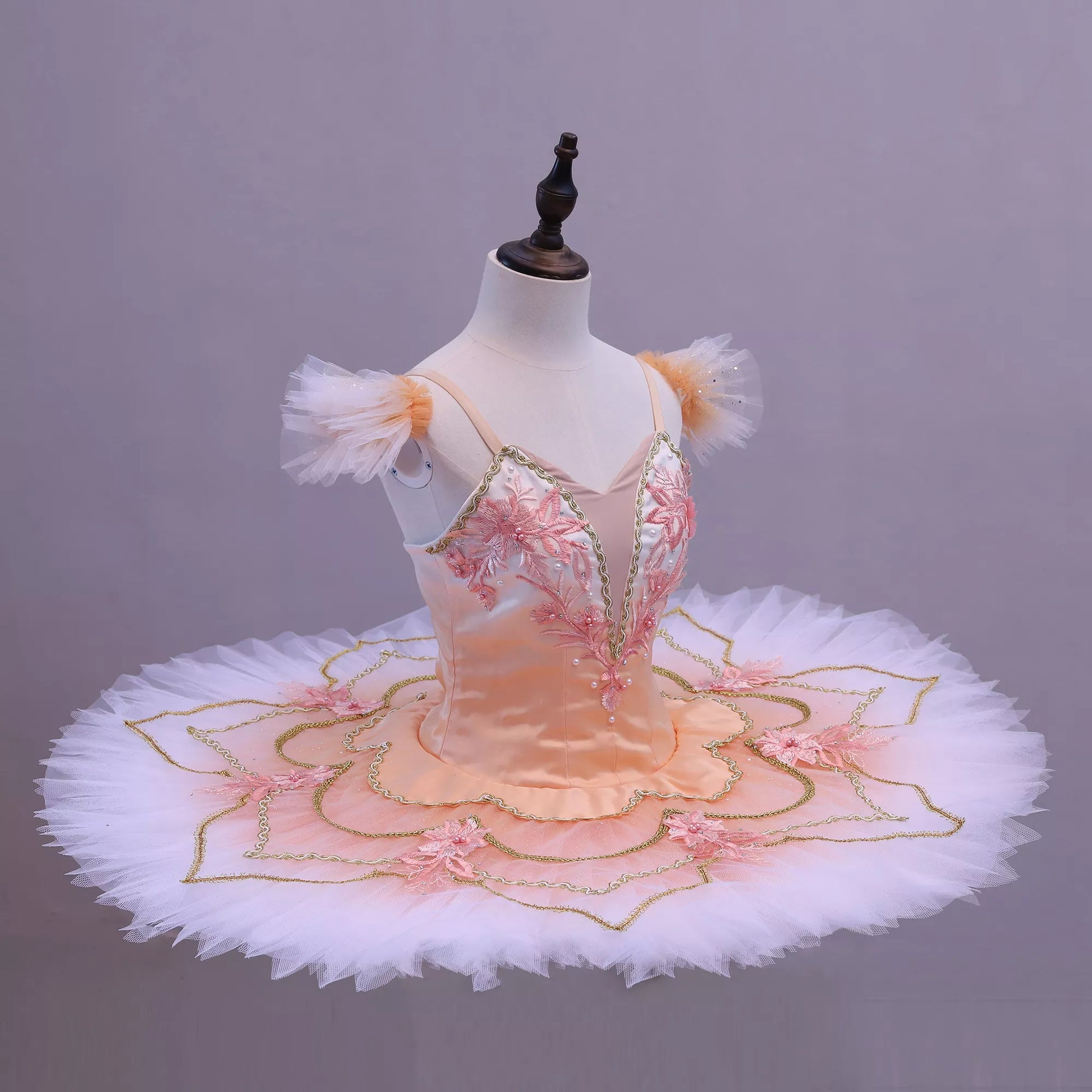Dieses professionelle Platter-Tutu hat eine entzückende Pfirsichfarbe. Das Oberteil besteht aus einem speziellen, halb dehnbaren, glänzenden Pfirsichstoff und ist reich mit silbernen Applikationen verziert.