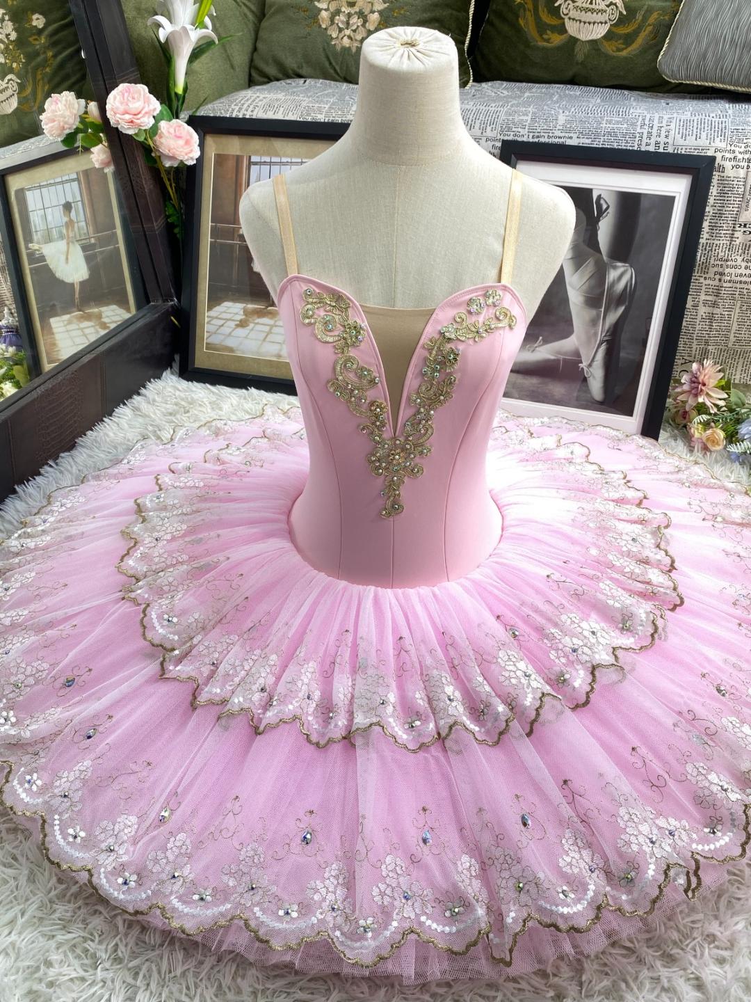 Der professionelle Tutu-Rock mit 10 Lagen ist mit weißer Spitze, goldenen Verzierungen, Applikationen und Glitzer verziert.