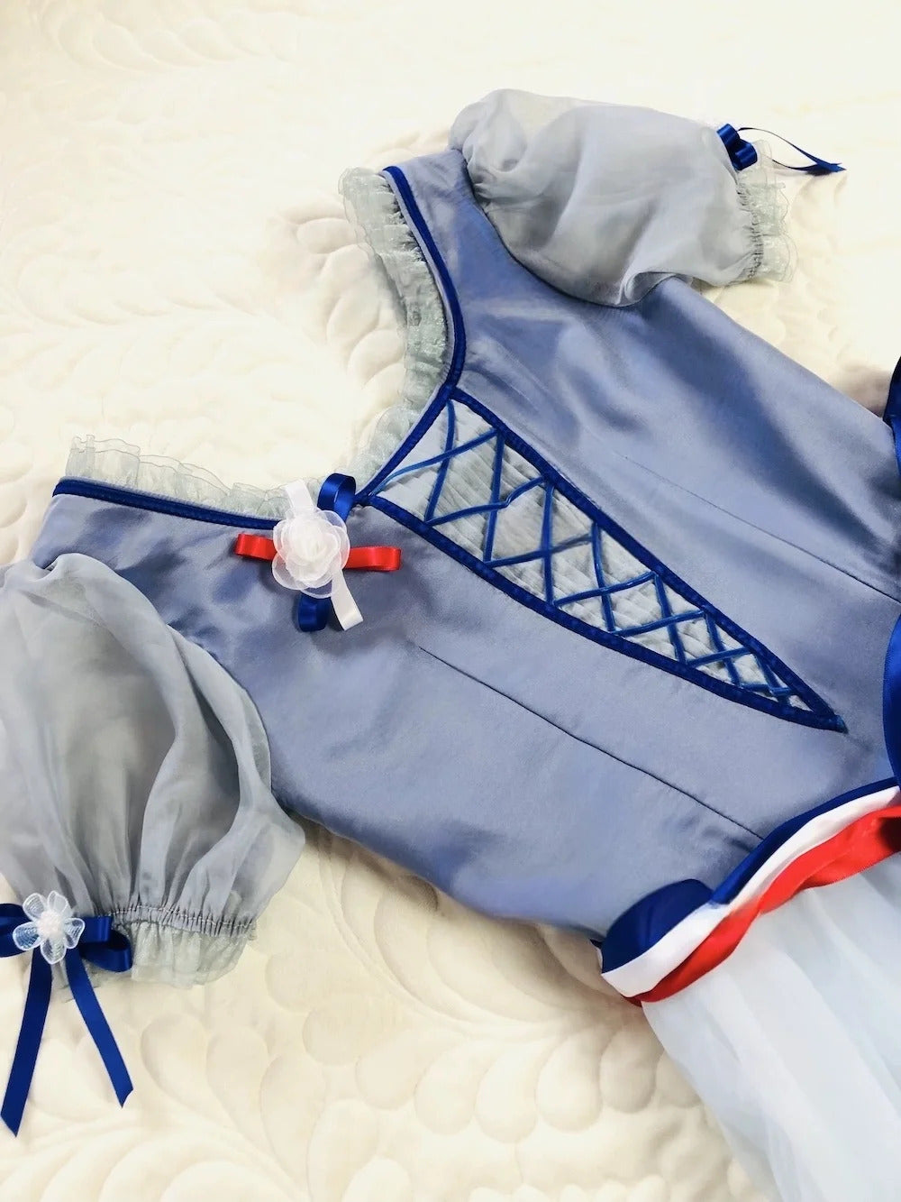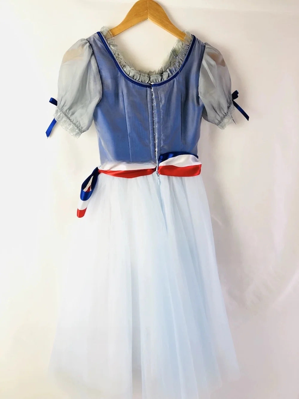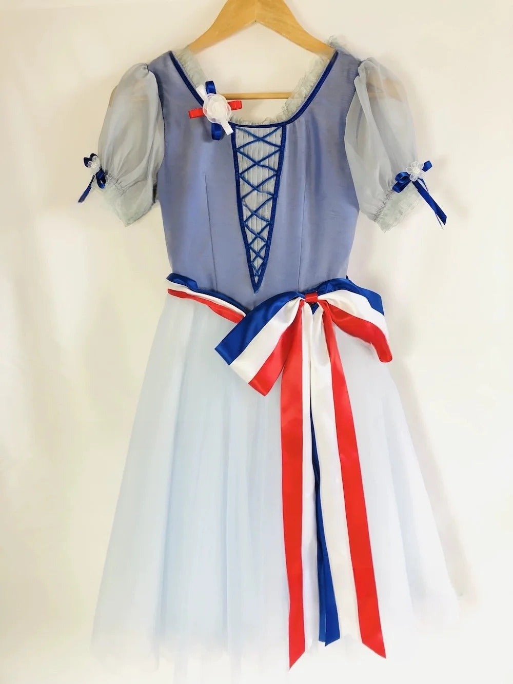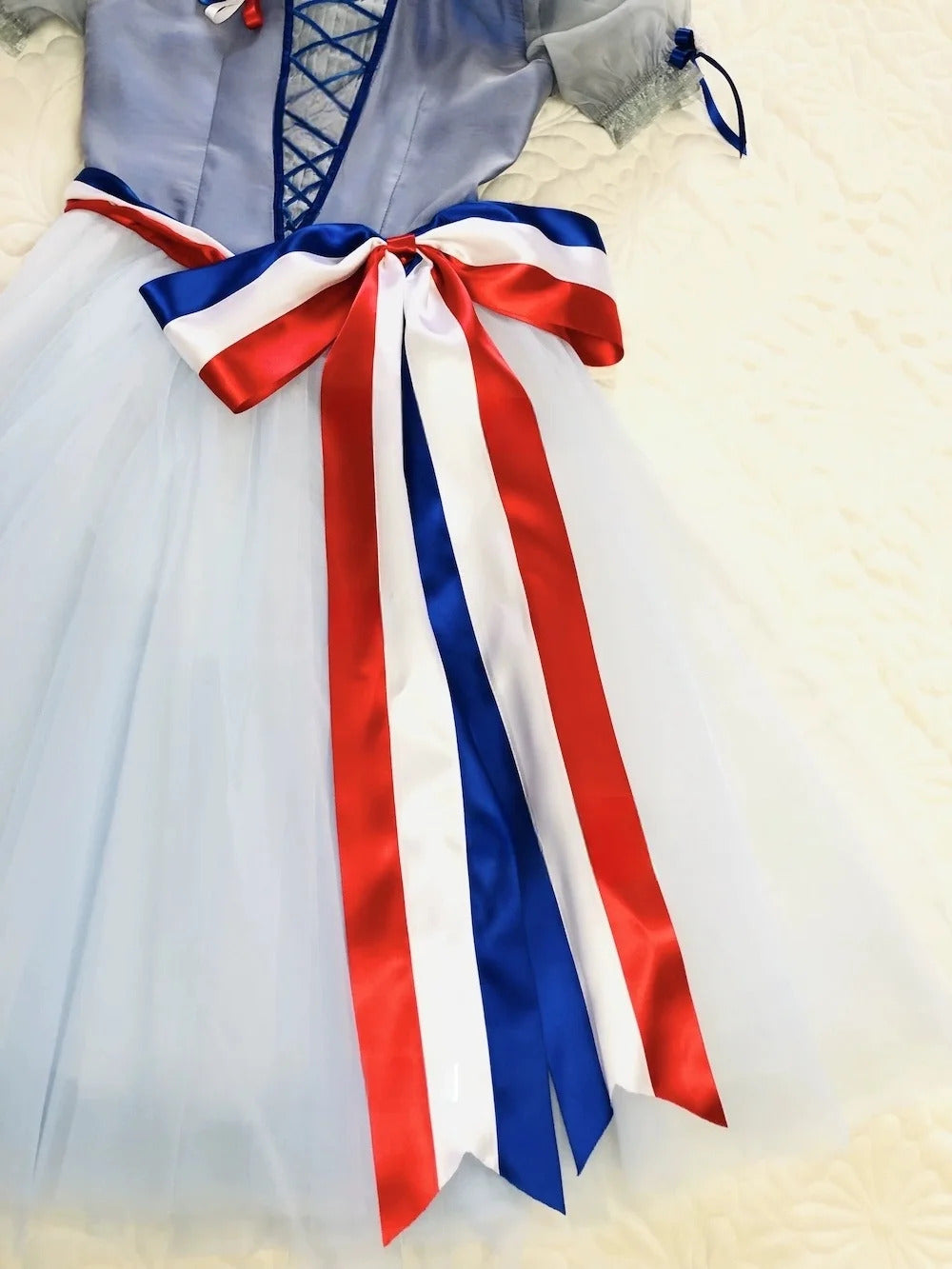 Der romantische Chiffonrock ist aus weißem und hellblauem Chiffon gefertigt und eine Satinschärpe in den Farben der französischen Flagge, die um die Taille gebunden ist, vervollständigt den Look dieses eleganten Bühnenkostüms.