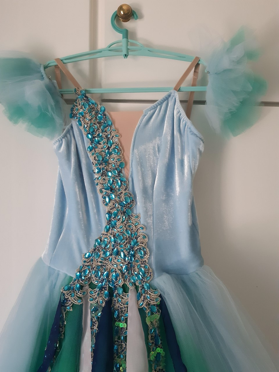 Der romantische Tutu-Rock ist hellblau und wurde mit der Ombre-Technik gefärbt, wobei er Schattierungen von Aquagrün aufweist. Die Verzierung des Rocks ist atemberaubend: blaue und grüne Kristalle über Chiffon in Blau und Elfenbein, kleine Schals, die am Rock befestigt sind.