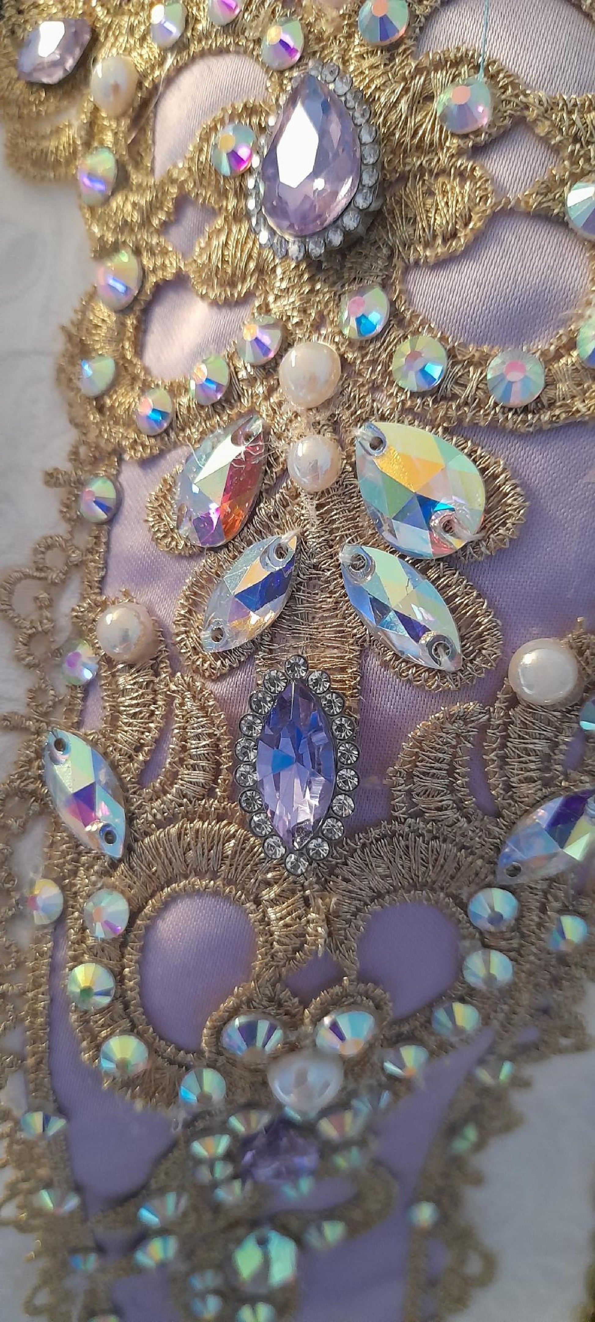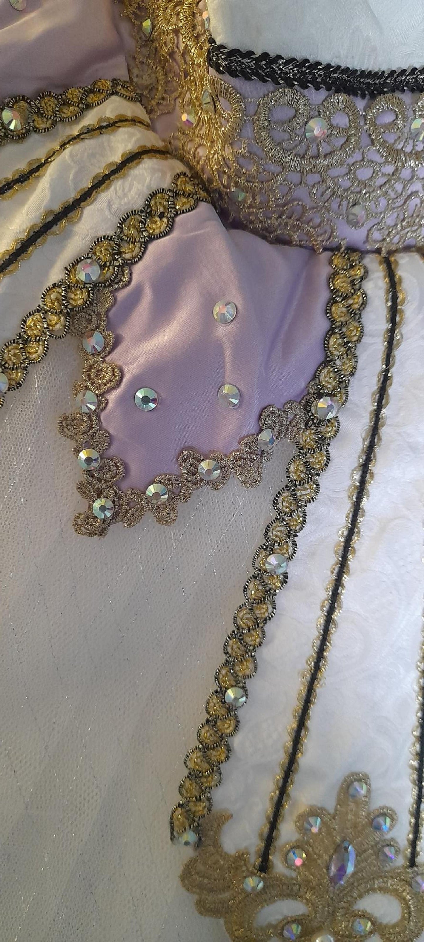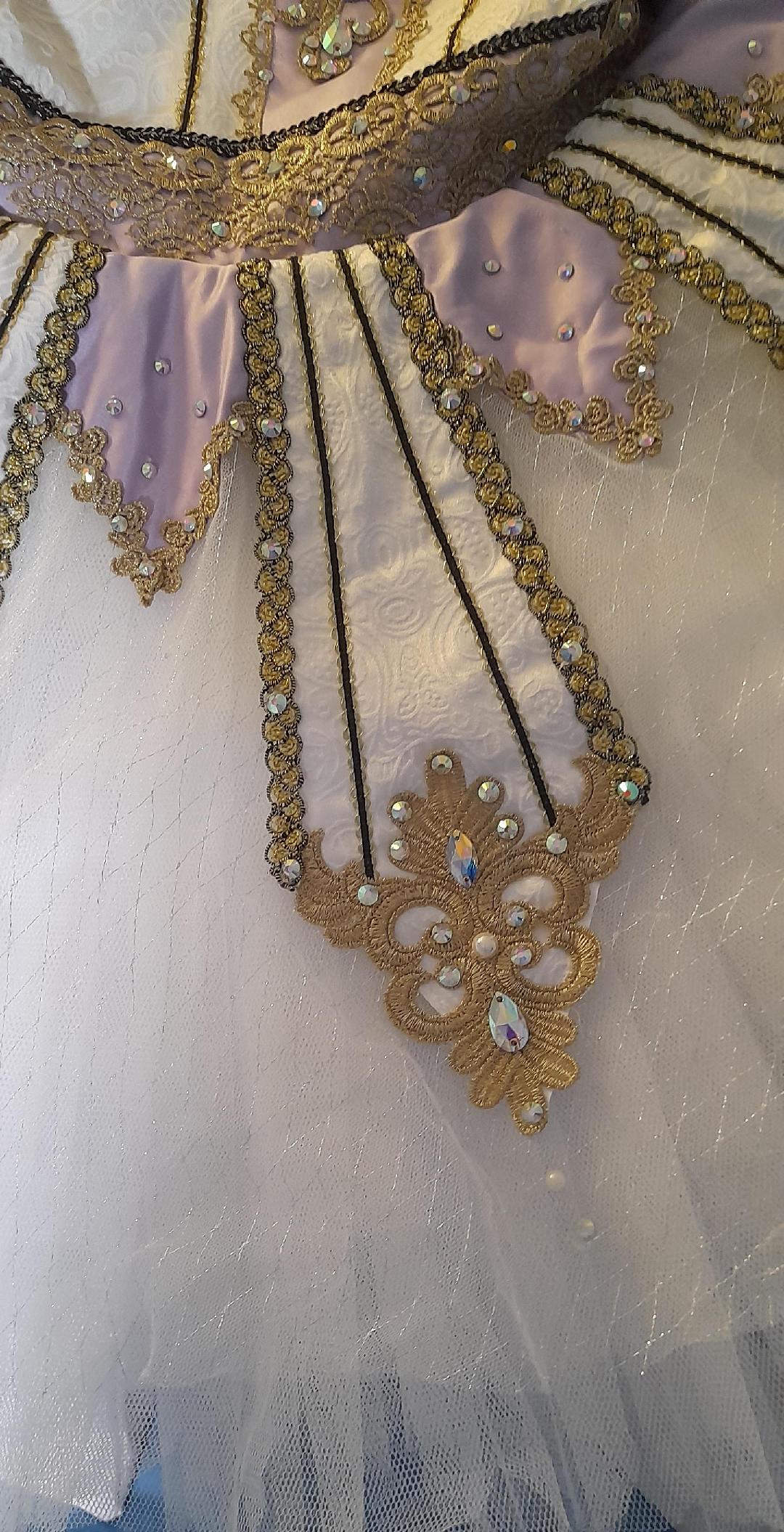 Der mittelalterliche Stil ist das Markenzeichen dieses Kostüms. Das elfenbeinfarbene Mieder ist aus hochwertigem Brokatstoff mit lila Einsätzen, schwarzen Verzierungen, lila Kristallen und goldener Spitze gefertigt. An den hautfarbenen elastischen Trägern sind Flügelärmel aus goldener Spitze befestigt. Der Taillenbereich des Mieders weist einen lila „gürtelähnlichen“ Einsatz, schwarze Verzierungen und bronzefarbene Spitze auf. Das professionelle Pfannkuchen-Tutu mit 10 Lagen ist weiß. Die typische Raymonda-Verzierung auf der ersten Lage des Tutu-Rocks besteht aus goldenen und lila Applikationen und Verzierungen sowie Kristallen.
