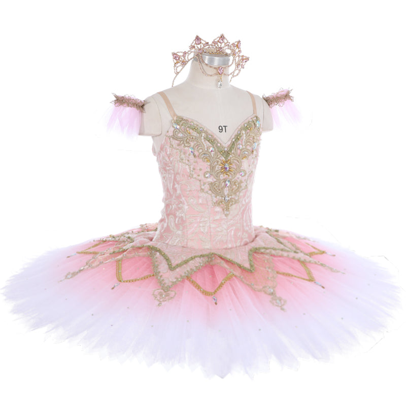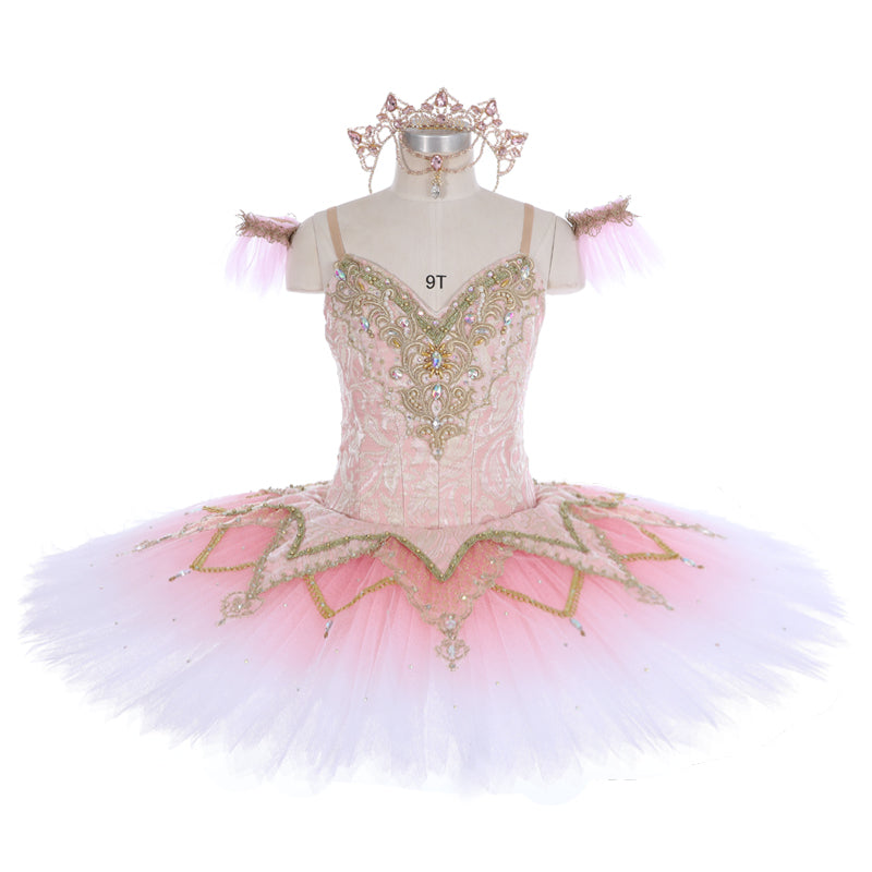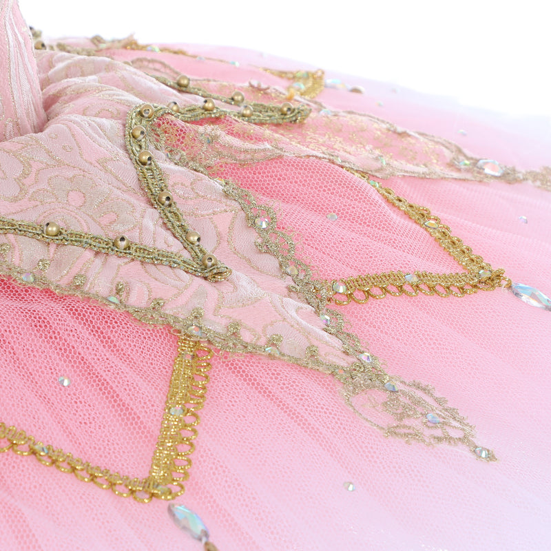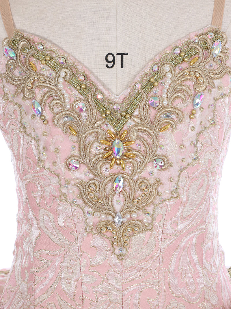 Das Oberteil ist aus rosa Brokat und mit üppigen Goldverzierungen versehen. Der Pfannkuchen-Tutu-Rock ist im Ombre-Stil mit verblassenden Rosatönen über Weiß gefärbt. Auch der Tutu-Rock ist rundherum reich mit Goldapplikationen, Perlen und Kristallen verziert.