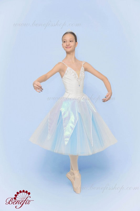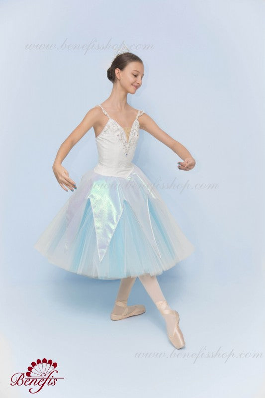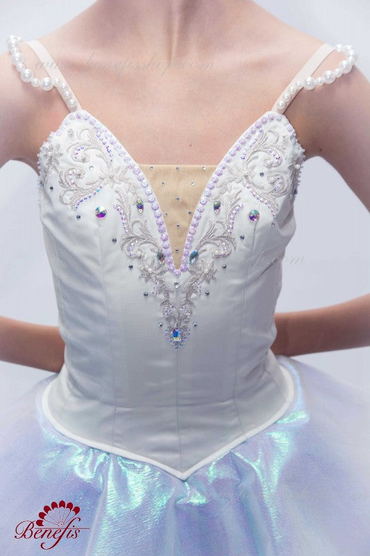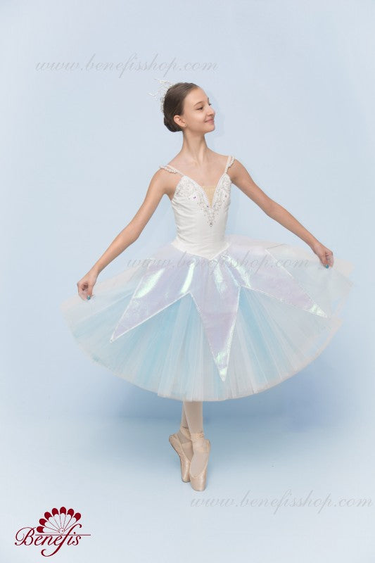 Dieses romantische Tutu ist perfekt für die Schneeflockenszene im Ballett Der Nussknacker. Dieses besonders glänzende professionelle Bühnenkostüm kombiniert Weiß und Hellblau für einen wunderbaren Effekt.