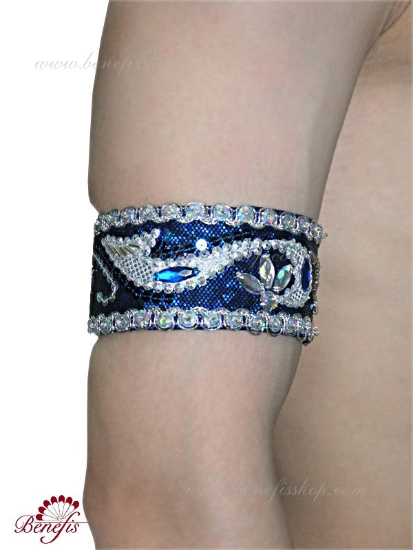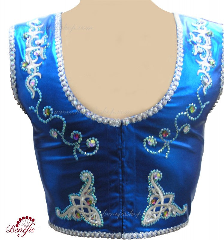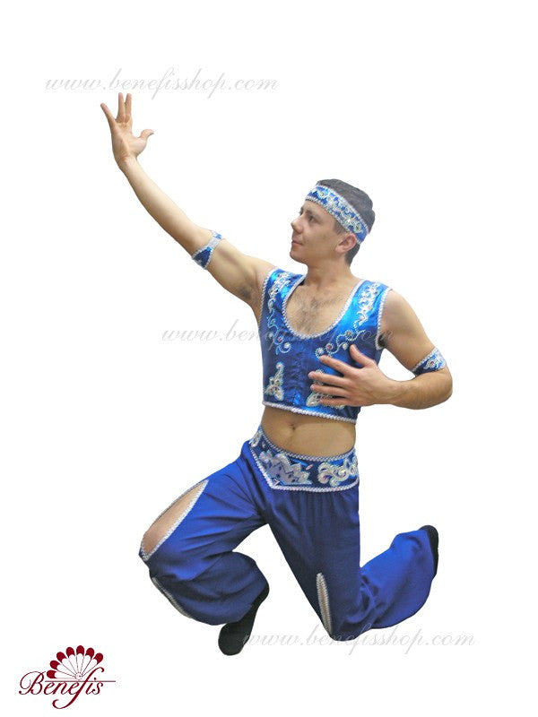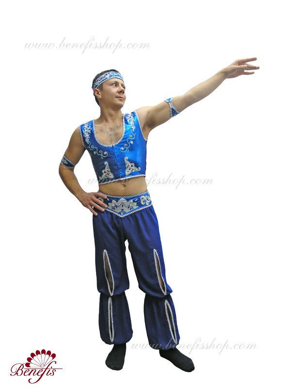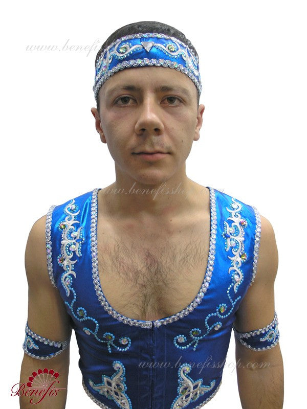 Weste, weite Hose, Kopfbedeckung, Armreifen. Die weite Hose ist aus Crêpe-Chiffon gefertigt und hat vorne einen Ausschnitt. Die Hose wird hinten geschlossen. Der Gürtel und die Manschetten der Hose sind mit blauen und weißen Kristallen unterschiedlicher Größe und Form bestickt. Die Armreifen und die Kopfbedeckung sind aus Gummiband gefertigt und ebenfalls mit Pailletten und Kristallen bestickt. Das Kostüm eignet sich perfekt für die Rolle des Solisten im Ballett „Le Corsaire“.