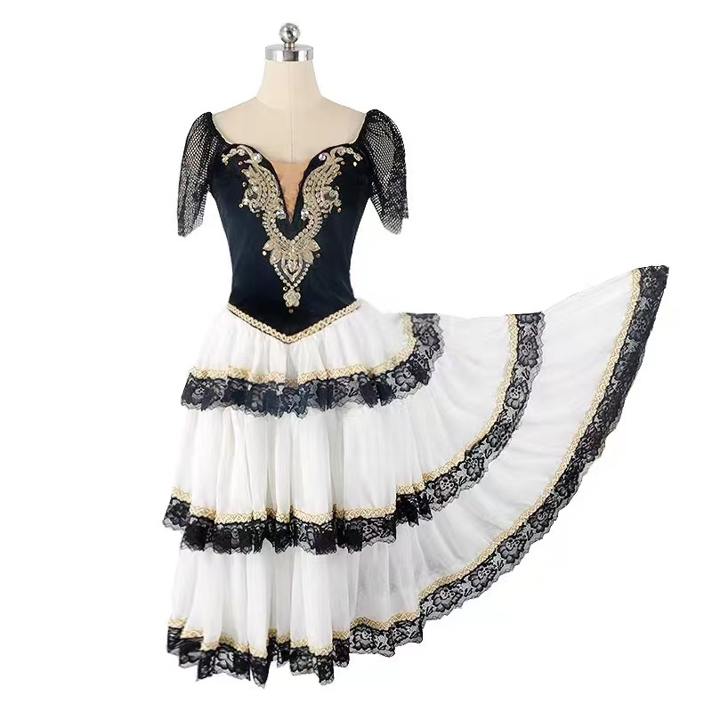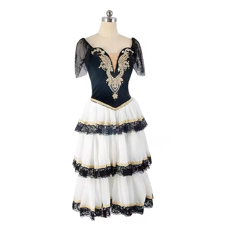 Dieses Bühnenkleid besteht aus einem schwarzen V-förmigen Tutu aus Samt, einem V-Ausschnitt mit hautfarbenem Einsatz und kurzen Ärmeln aus schwarzem Netzstoff, die auf die hautfarbenen Träger genäht sind. Die Verzierung des Oberteils ist sehr reichhaltig und besteht aus goldenen Applikationen, Kristallen und Pailletten.