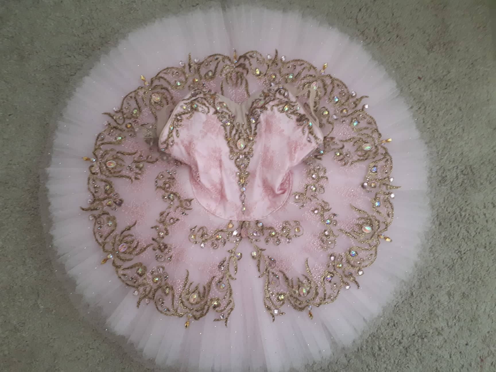 Der professionelle Pfannkuchen-Tutu ist weiß und verfügt über einen rosa Tuturock, der sehr reich mit antiken Goldapplikationen verziert ist, was dieses Kostüm zu einem einzigartigen Bühnen-Tutu macht.