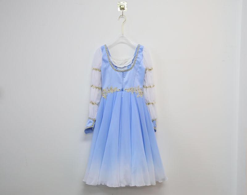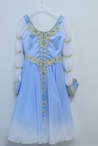 Das Oberteil besteht aus himmelblauem Satin und ist mit glänzenden Verzierungen und Kristallen verziert. Die langen weißen Chiffonärmel weisen die typische Verzierung auf, die für den Schwanensee-Pas de Trois verwendet wird. Der knielange Chiffonrock weist eine verblassende Ombre-Farbe und eine reiche Verzierung auf.