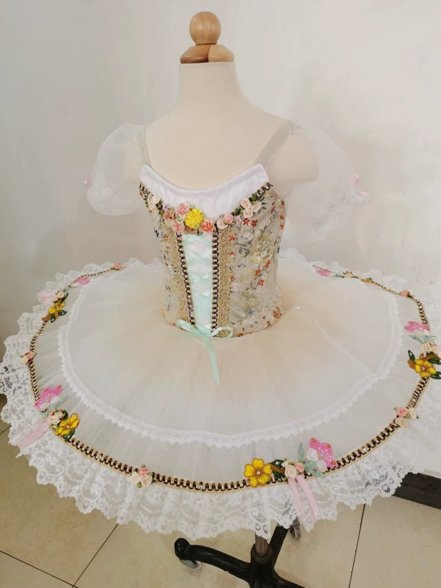 Dieses komplett handgefertigte Tutu ist eines der neuesten in unserer Kollektion. Es wurde von einer berühmten Designerin für Tanzbekleidung von Patricia entworfen und ist für Ballette wie Coppelia oder La Fille Mal Gardee gedacht.