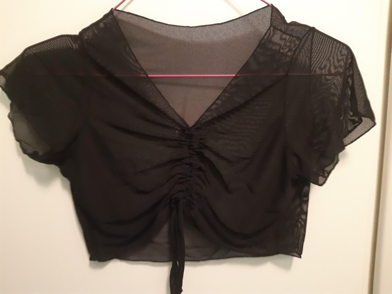 Hübsches, bauchfreies Netztop mit kurzen Ärmeln und verstellbarer Raffung in der Mitte.
