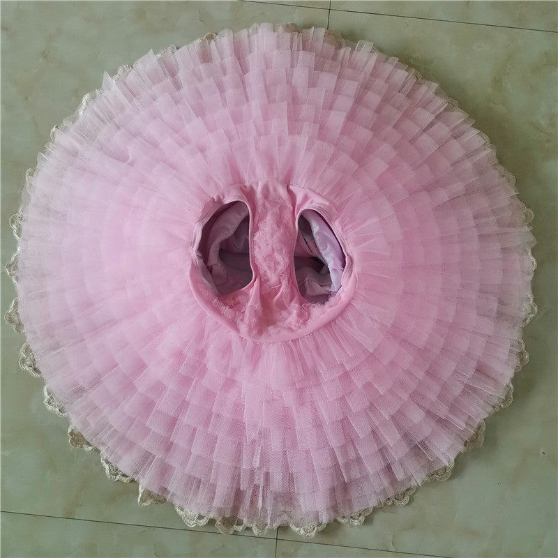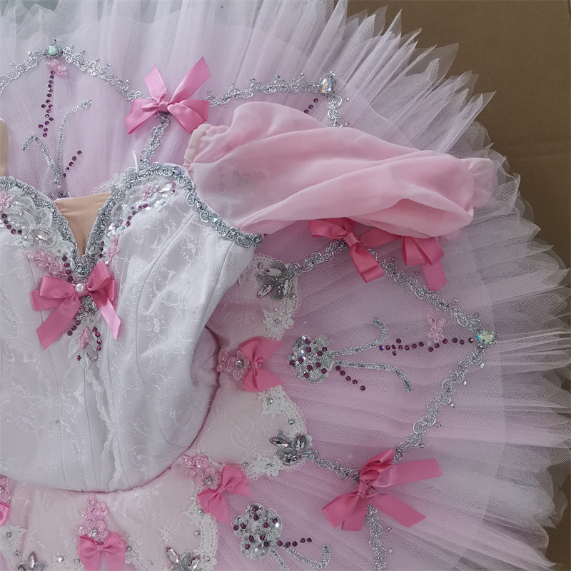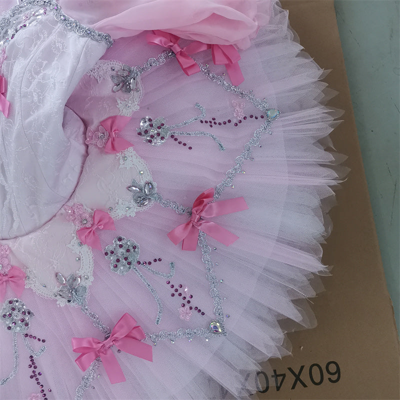 Der handgefaltete, professionelle rosa Tutu-Rock ist sehr reich verziert mit rosa Satinschleifen, Strasssteinen, Kristallen und einem kleinen rosa Tutu-Rock aus Brokat, der zum Mieder passt.