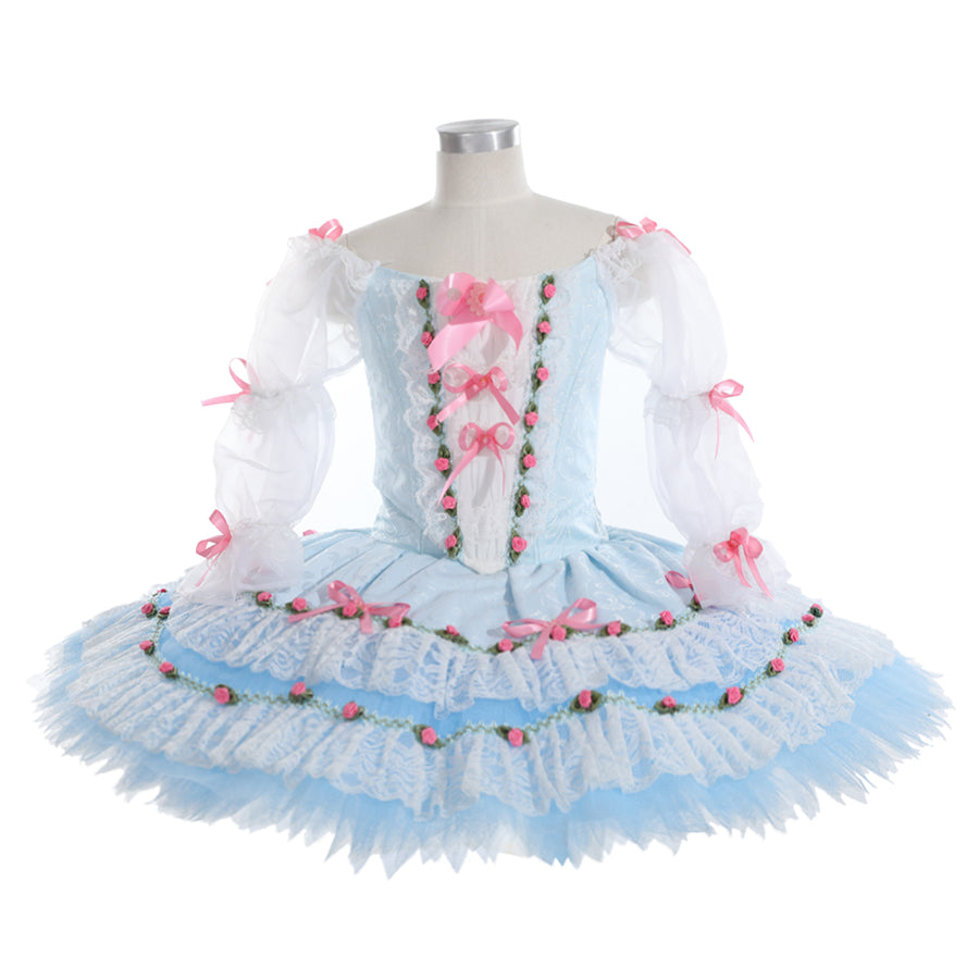 Dieses professionelle, einzigartige Tutu aus zehn Lagen wird aus verschiedenen Stoffen und Hellblautönen sowie weißer Spitze und rosa Bändern und Knoten hergestellt.