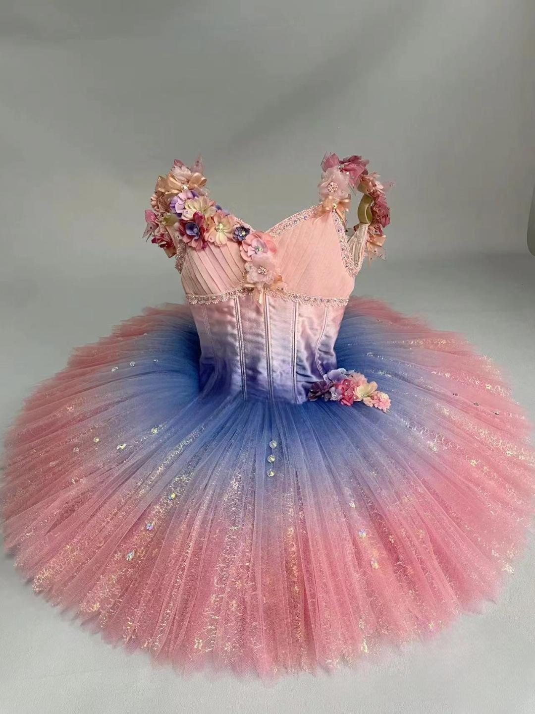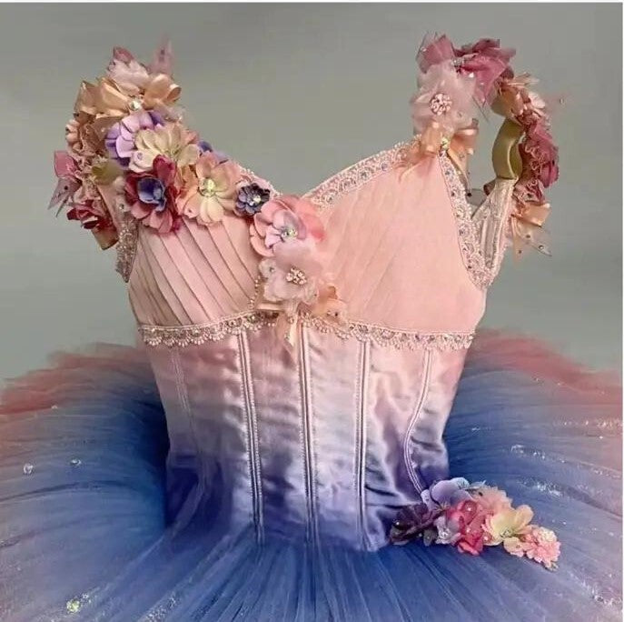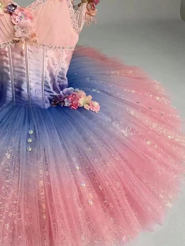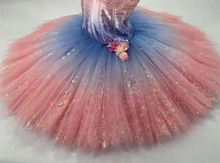 Der leicht glockenförmige, zehnlagige Tutu-Rock ist in zwei Farben erhältlich: oben blau, nach unten hin zu rosa hin. Die oberste Lage besteht aus glitzerndem Tüll und ist mit Kristallen verziert.