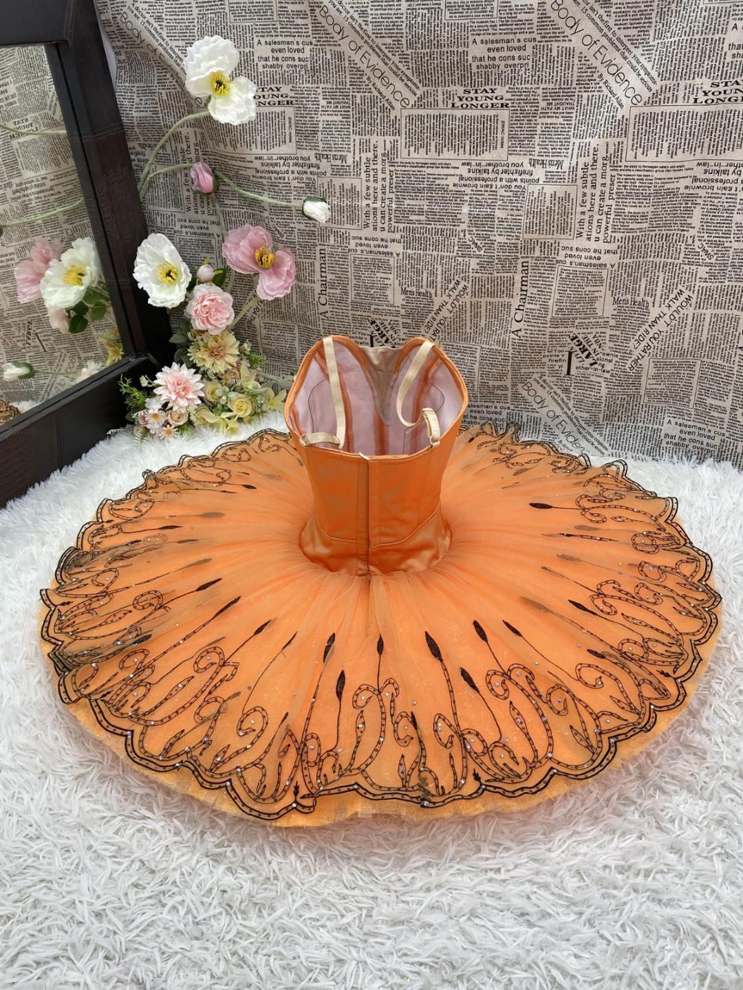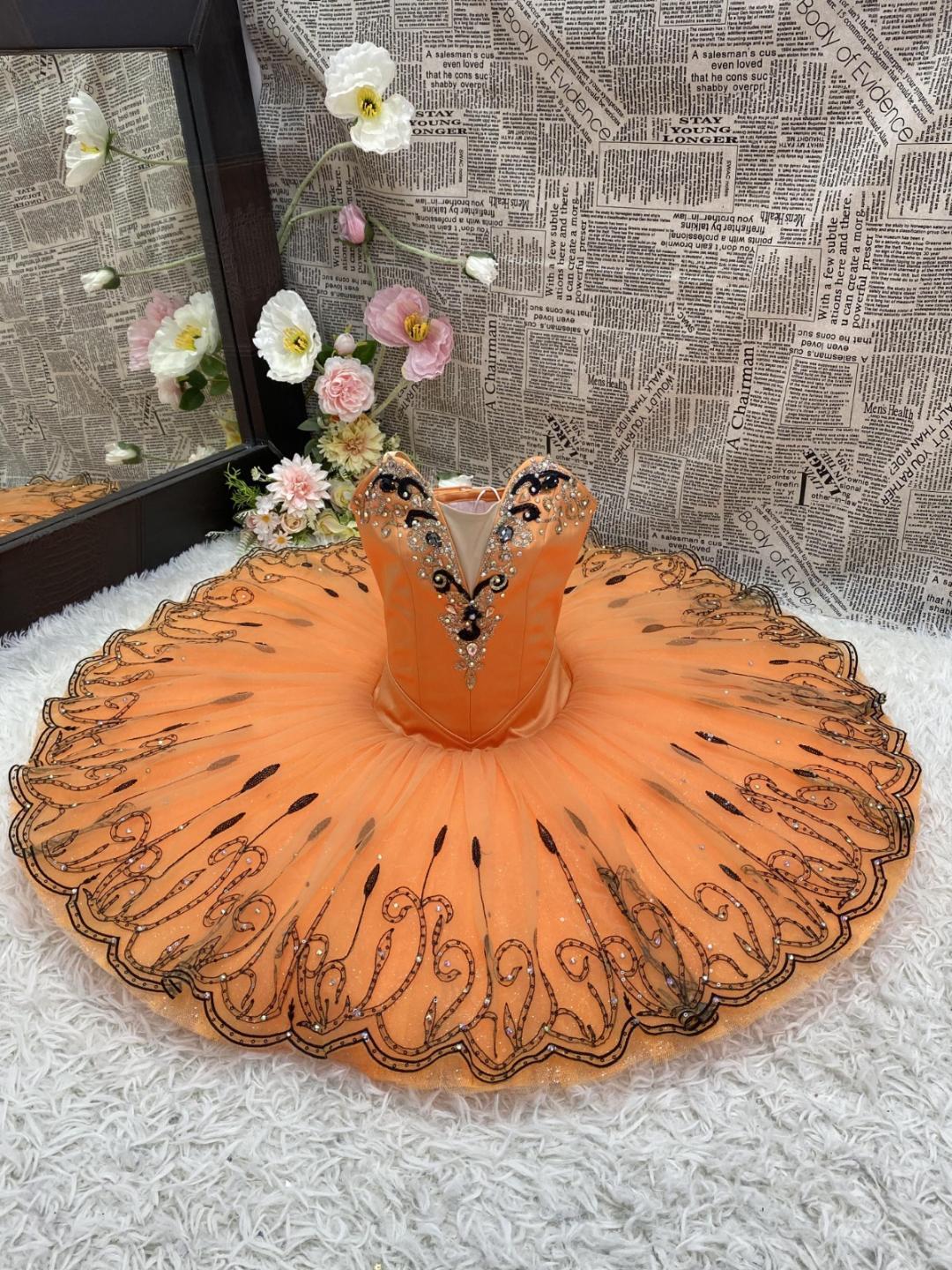 The 12 layers, slightly bell-shaped tutu skirt is made with deep peach fine tulle, and is decorated with black appliques, trims and crystals.