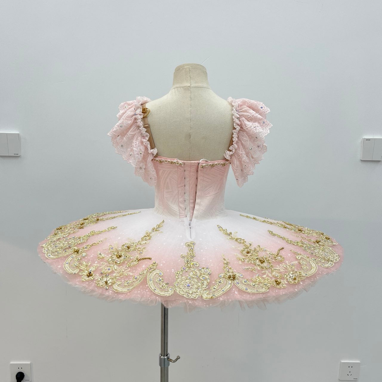 The bodice is a professional one: it fastens in the back with a double row of hooks and eyes and is made with ombre' dyed jaquard fabric, featuring gradient shades of pink. There is a deep V neck with nude insert and pink lace cap sleeves attached to the nude straps. The decoration on the bodice is very rich: we used golden appliques, sequins, trims and crystals.