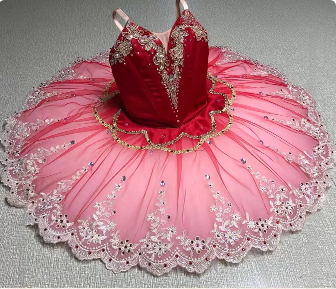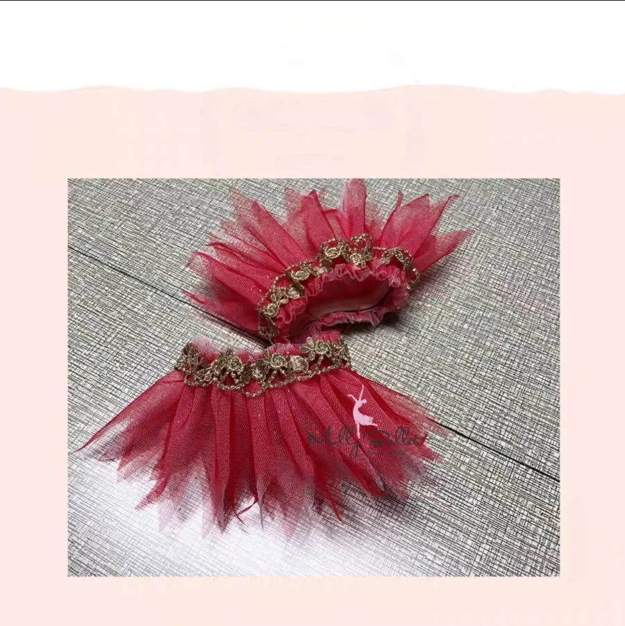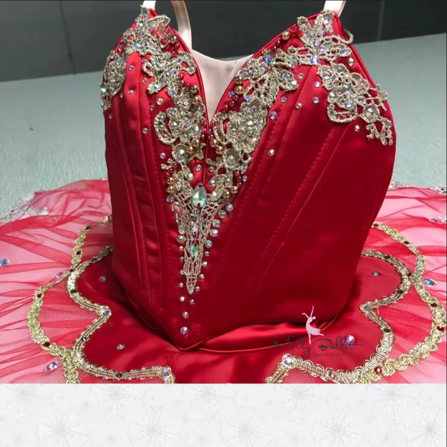 The slightly bell-shaped, ten layers tutu skirt is made with red tulle, and is embellished with white lace and crystals.