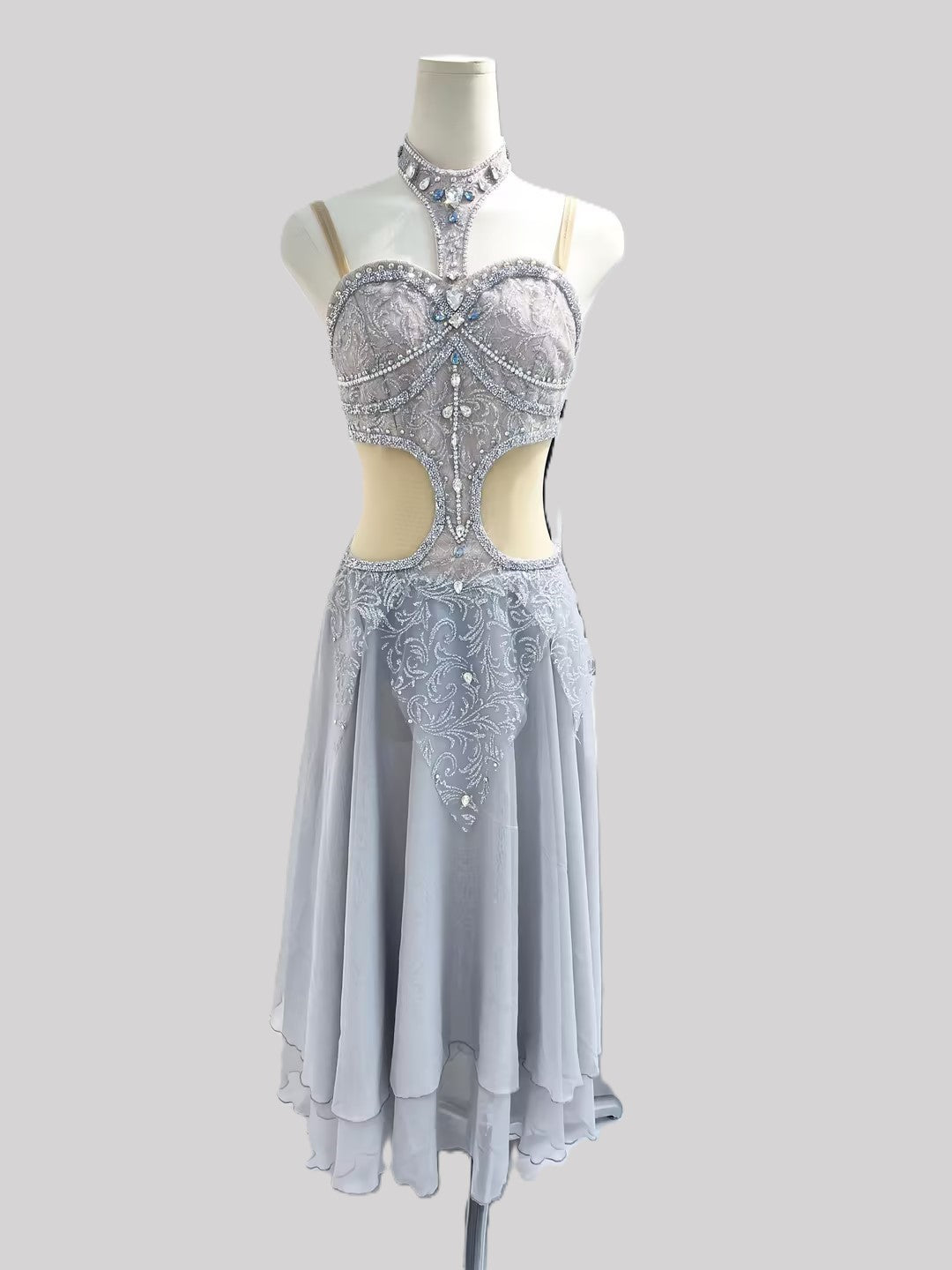 The sweetheart neck top part is made with grey and silver brocade and features a halter neck entirely decorated with crystals. The top is embellished with hundreds of rhinestones and crystals as well. The stomach area is made with nude mesh and the costume fastens in the back with hooks and eyes.