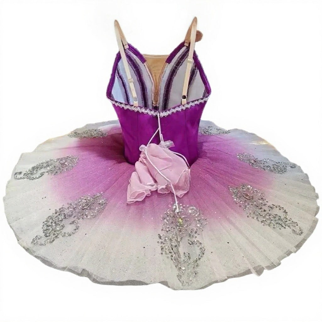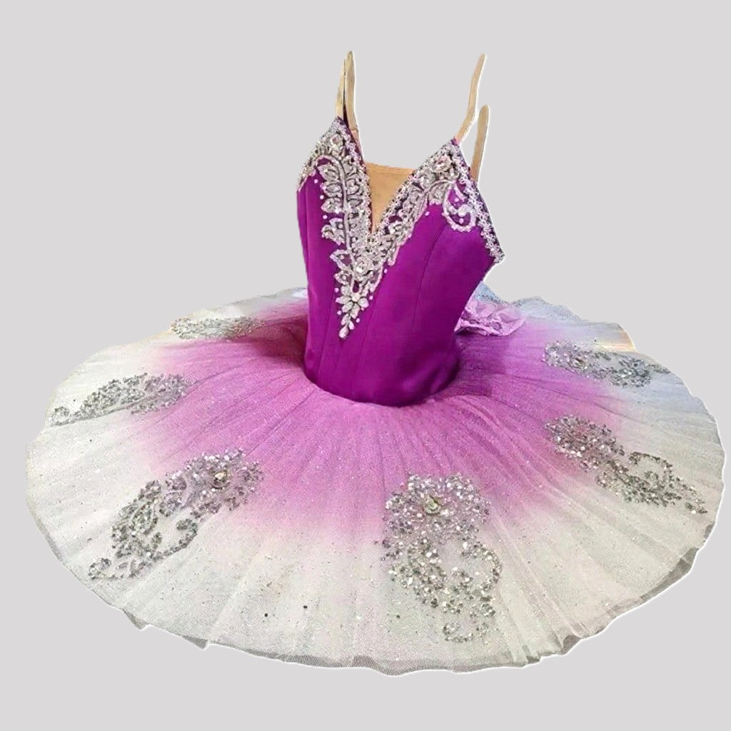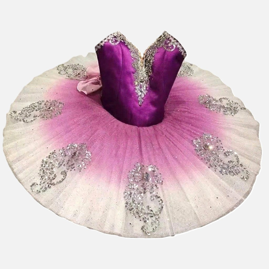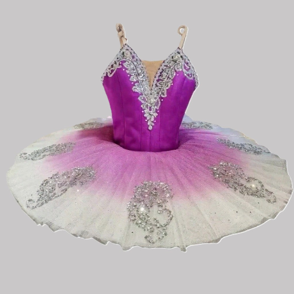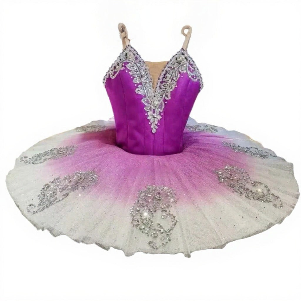 Ombre' dyed Sugar Plum Fairy professional tutu. Satin plum bodice with deep V neck and nude insert, richly decorated with silver appliques, crystals and sparkles.