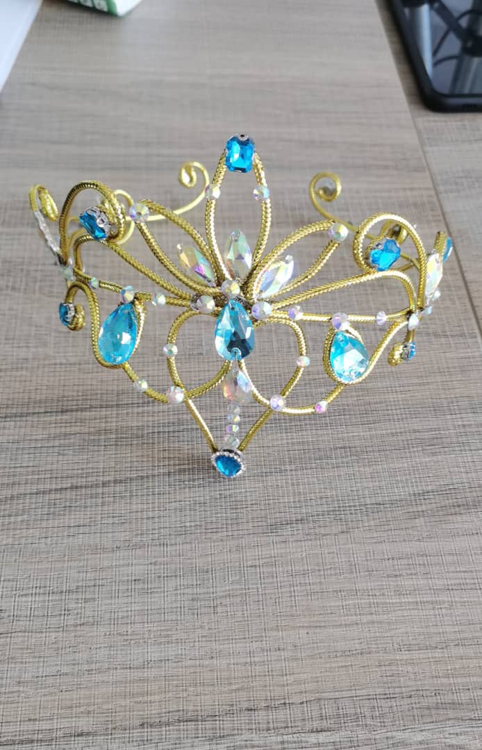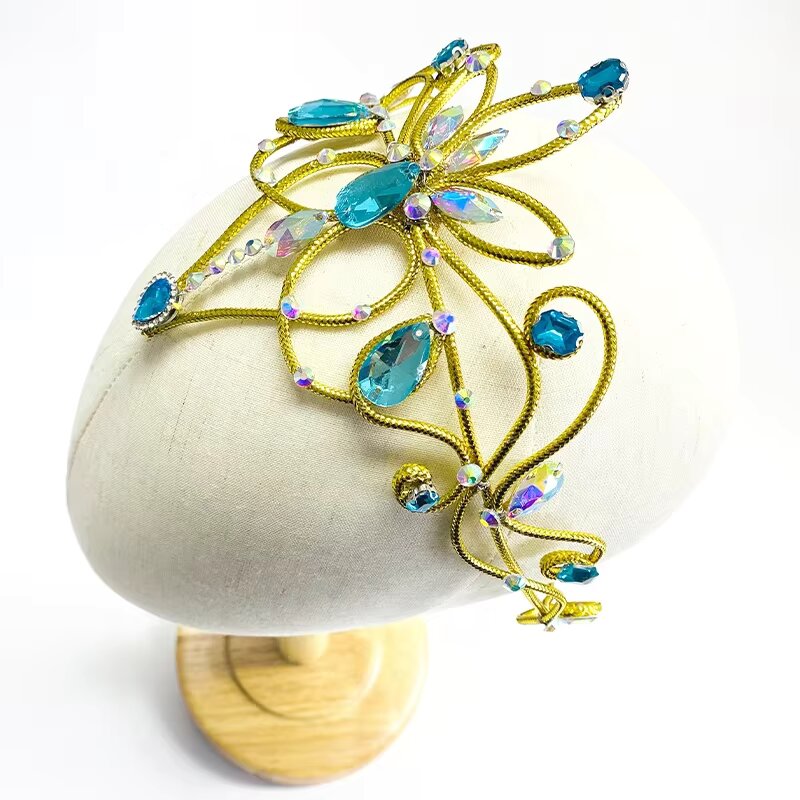 The stones decorating the headpiece are turquoise, mixed with crystals and pearls.