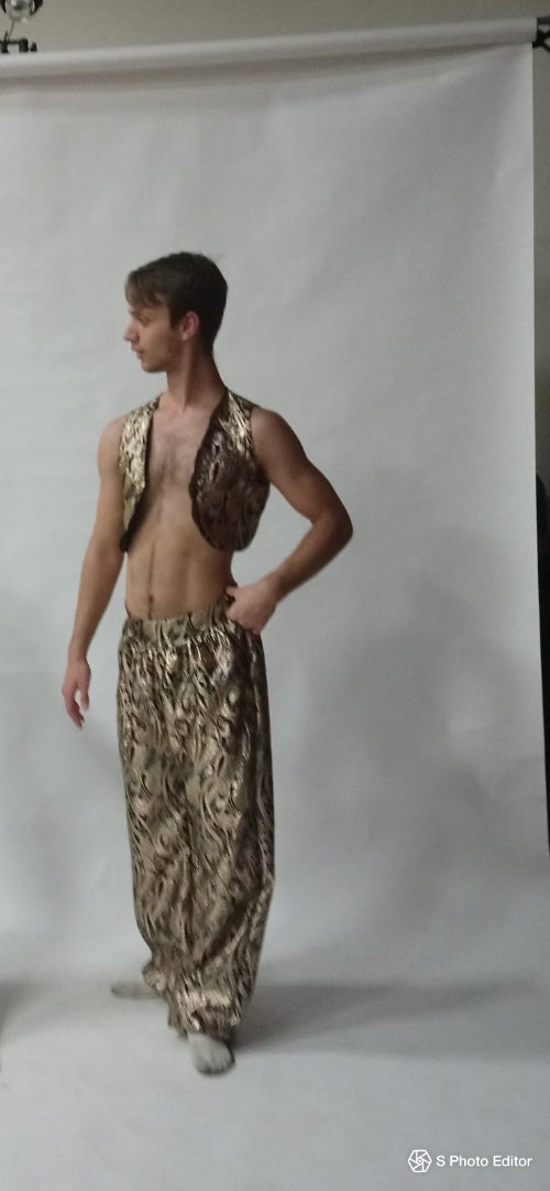 This professional stage costume features a short, open in the front vest with rounded edges, and puffy Arabian long pants with elastics on the ankles.