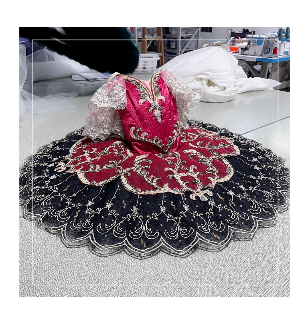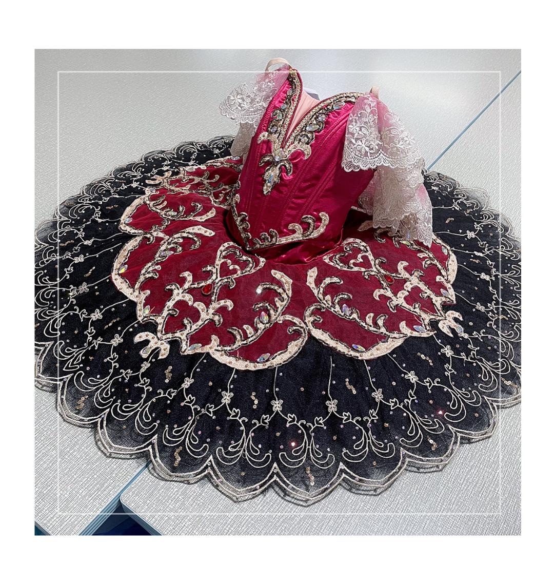 The bell shaped tutu skirt is made with black, high quality tulle, embellished with silver trims. There is a red, flower-shaped overlay made with red tulle, decorated with golden trims and crystals.