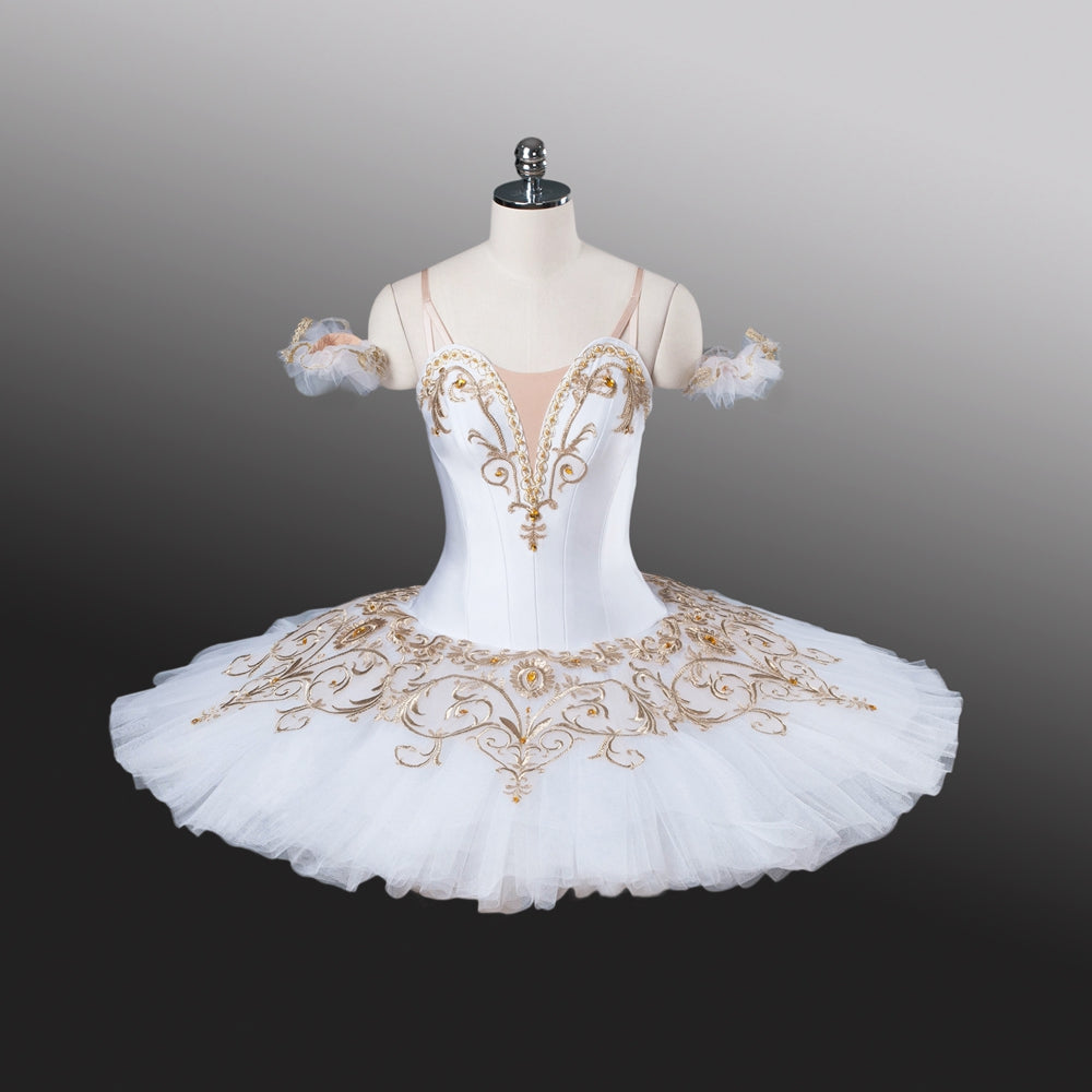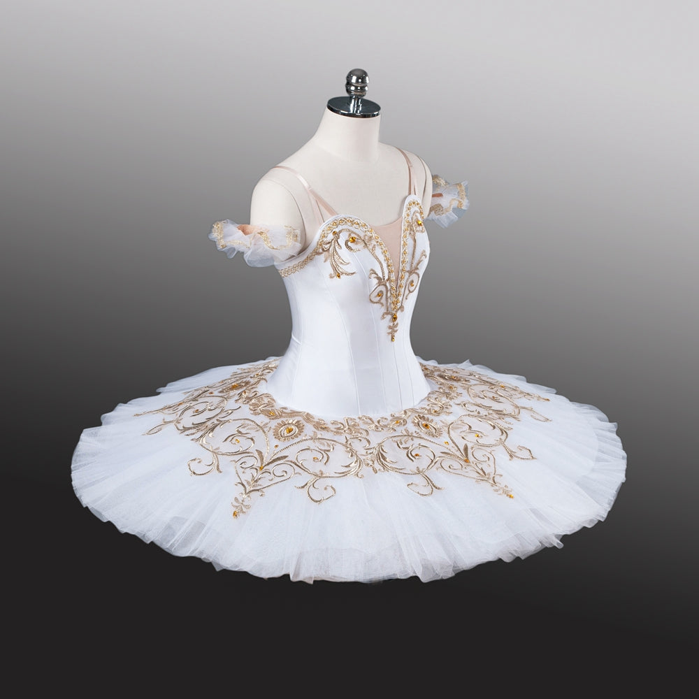 The professional, 10 layers tutu skirt is white, and also richly decorated with golden appliques and crystals.