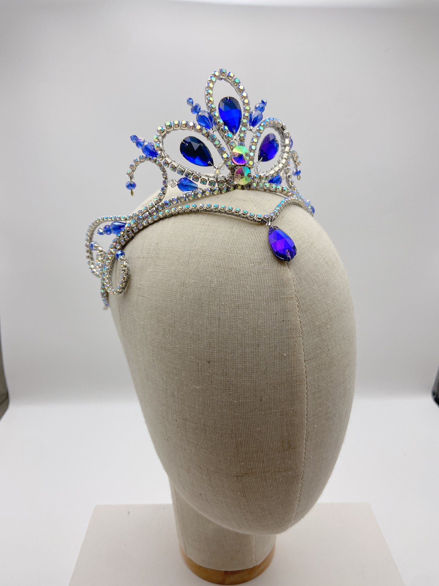 Entirely hand crafted tiara with unique design, wired on a silver base with rhinestones, and featuring big, deep blue crystals. This tiara is suitable for the role of Gulnare or Medora in Le Corsaire, for Raymonda, Princess Florina, and many other classical variations.