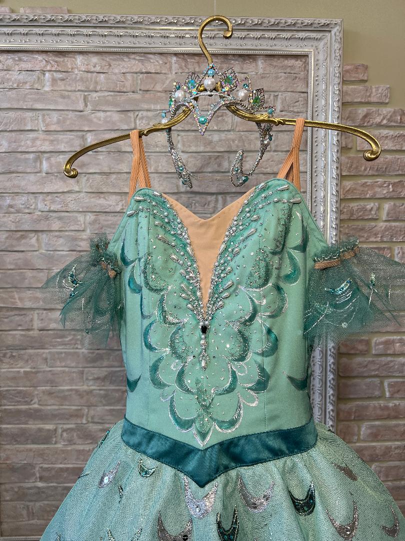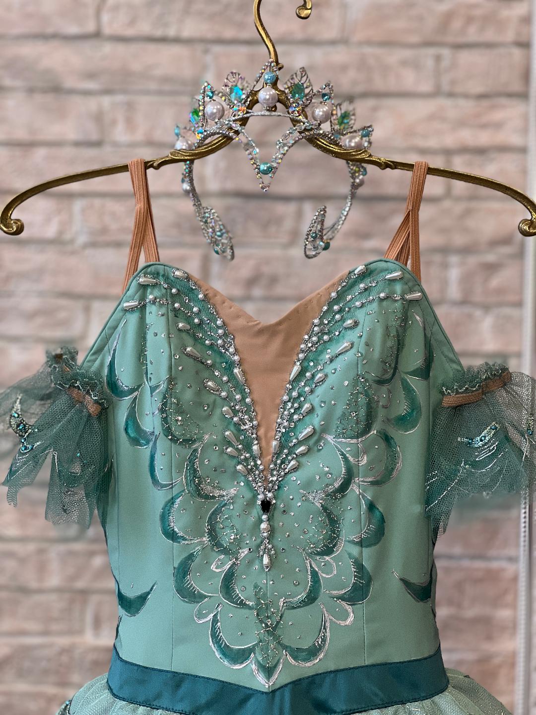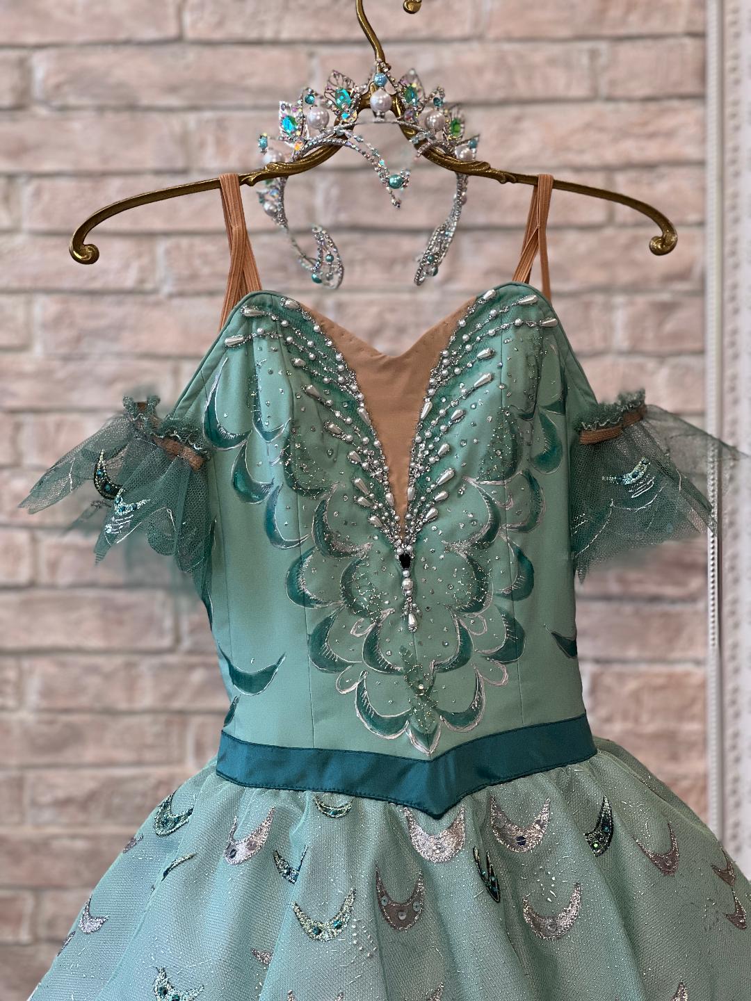 The bodice and the tutu overlay are made with turquoise, special semi-stretchy fabric, and decorated with shiny turquoise and silver appliques, white pearls in different sizes, and crystals. Nude insert and hooks and eyes closure in the back.