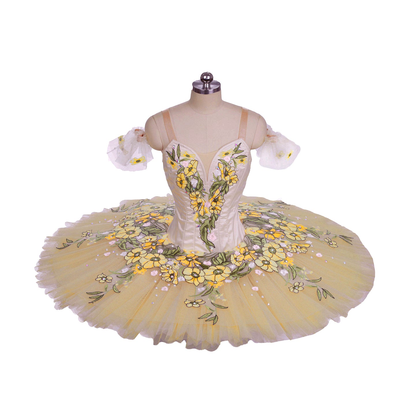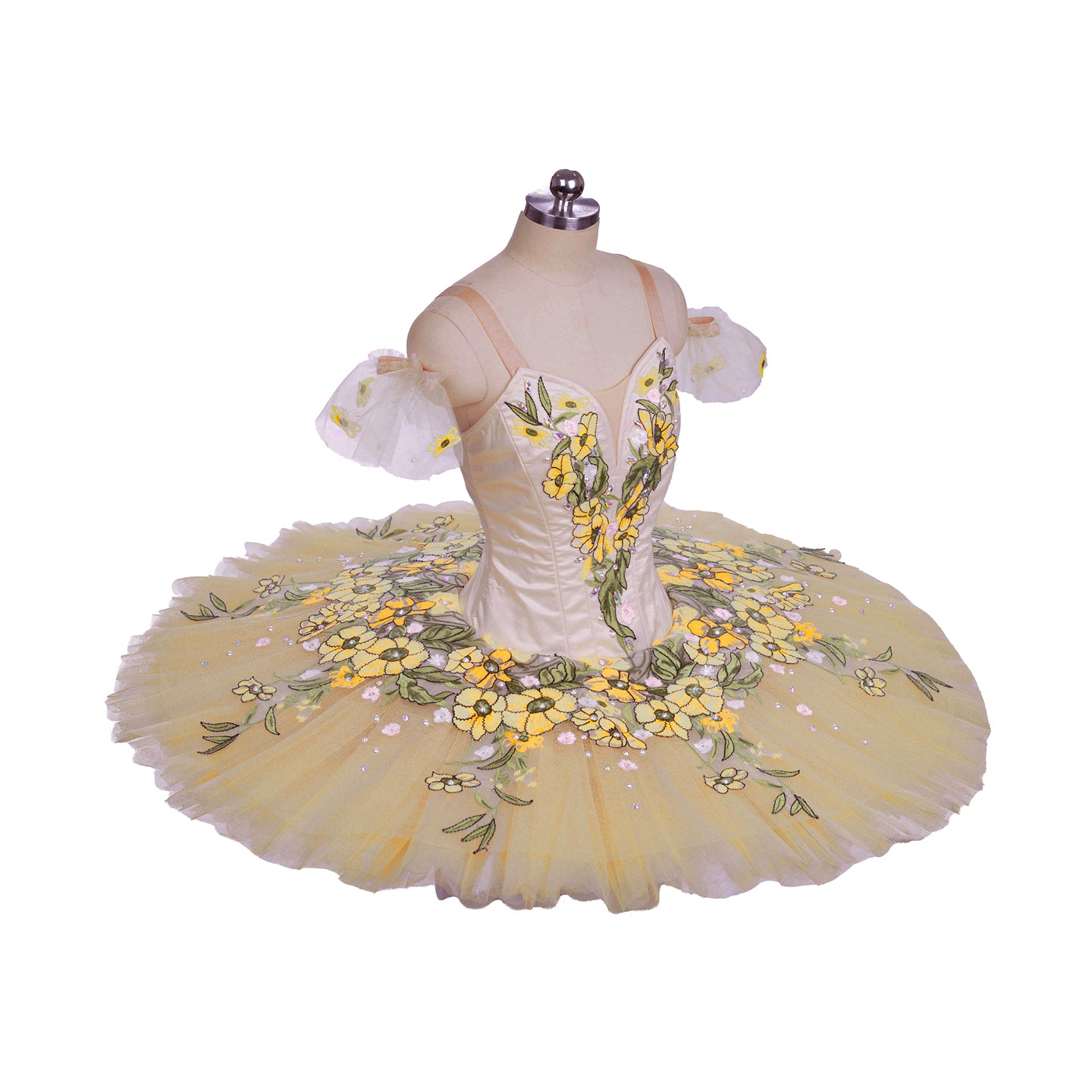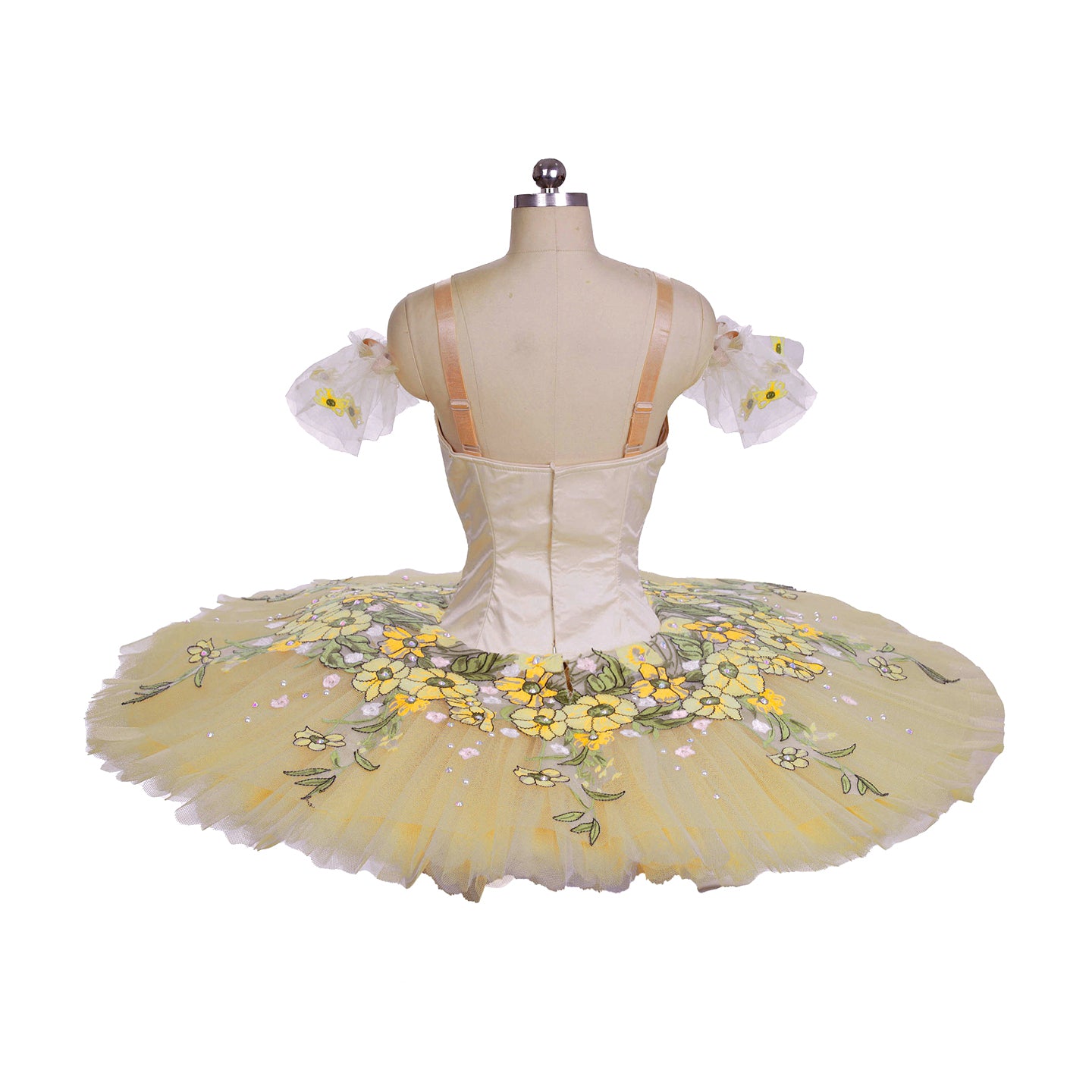 The professional, 12 layers golden yellow tutu skirt is embellished with the same appliques as the bodice, as well as sparkles.