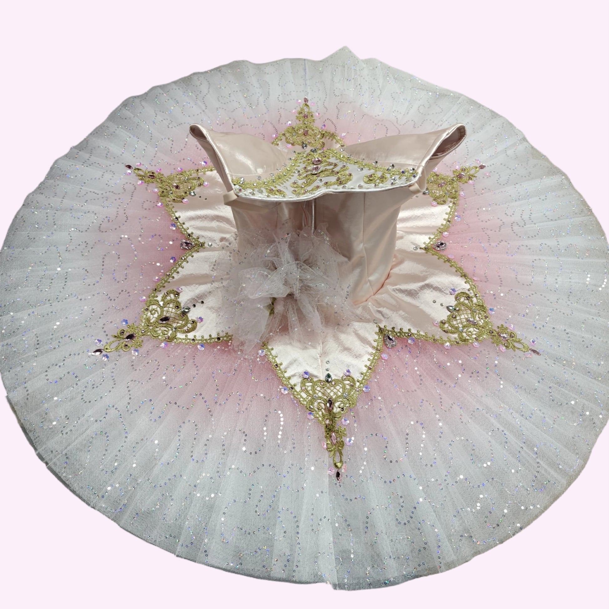 This professional tutu is just amazing! Made with pastel pink satin and fully decorated in gold, this tutu is suitable for any grand pas or classical role (Sugar Plum Fairy, Princess Aurora, Queen of the Dryads, Coppelia, Fairies etc).