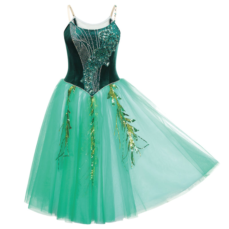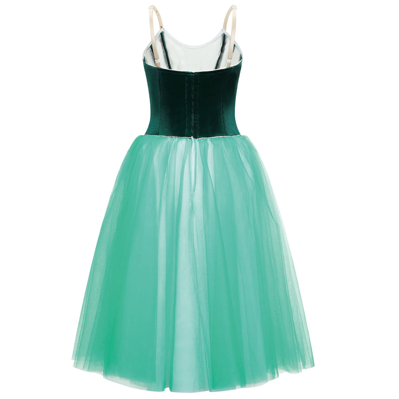 It is a professional Romantic costume featuring a deep green fitted velvet bodice, embellished with rich green and silver decorations, and green crystals.