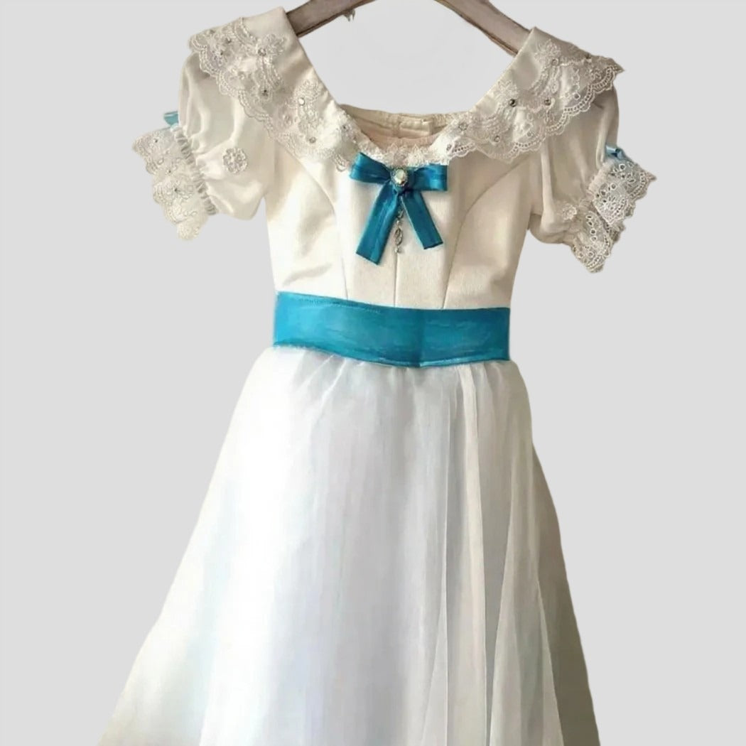 This professional stage costume features a white bodice with white lace round neck, and back closure with hooks and eyes. The balloon three-quarter sleeves are also decorated with white lace and blue satin ribbon. The centrer of the chest is decorated by a blue satin ribbon.