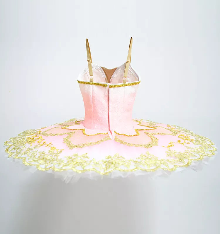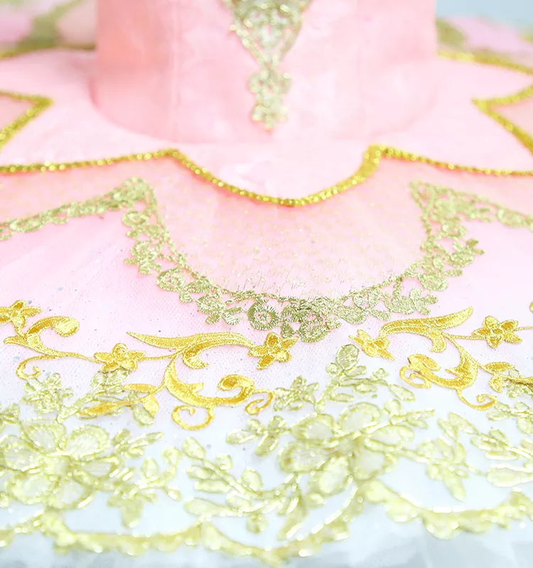 The 10 layer professional platter skirt is pink, fading to white, entirely decorated in god.