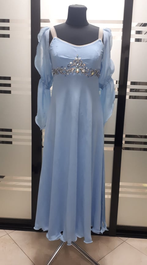 The dress is made with a very sweet shade of pale sky blue chiffon.
