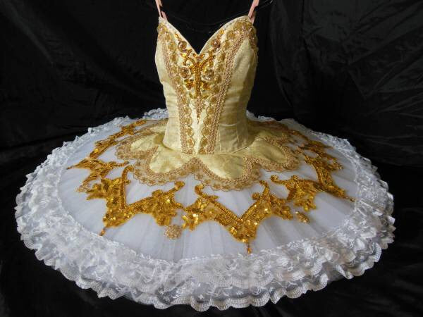 This white and gold tutu has been created for the role of Raymonda. It is also suitable for roles like the Gold Fairy in Sleeping Beauty or for other classical variations. The golden bodice is heavily decorated with gold trims, beads, sparkles and gold sequins. It features nude straps and arm ruffles included.