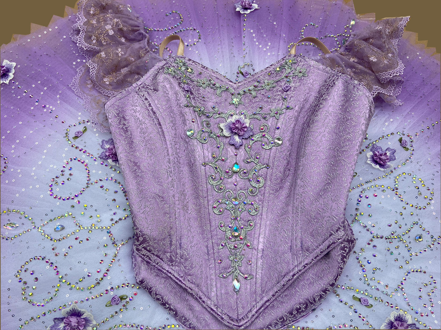 Deep lilac brocade V-shaped bodice, richly hand decorated with silver appliques, crystals and flower appliques.