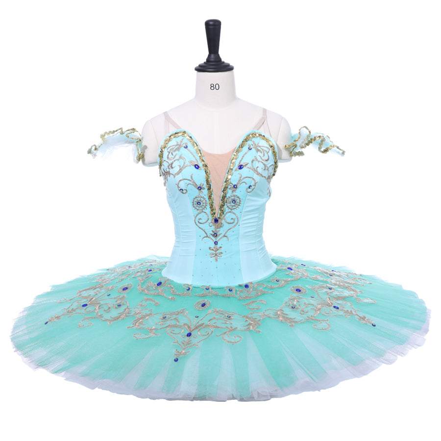 This amazing turquoise blue professional tutu, is ideal for the role of Princess Florina in The Blue Bird. The bodice features a delicate shade of turquoise blue, with rich gold appliques and blue stones.