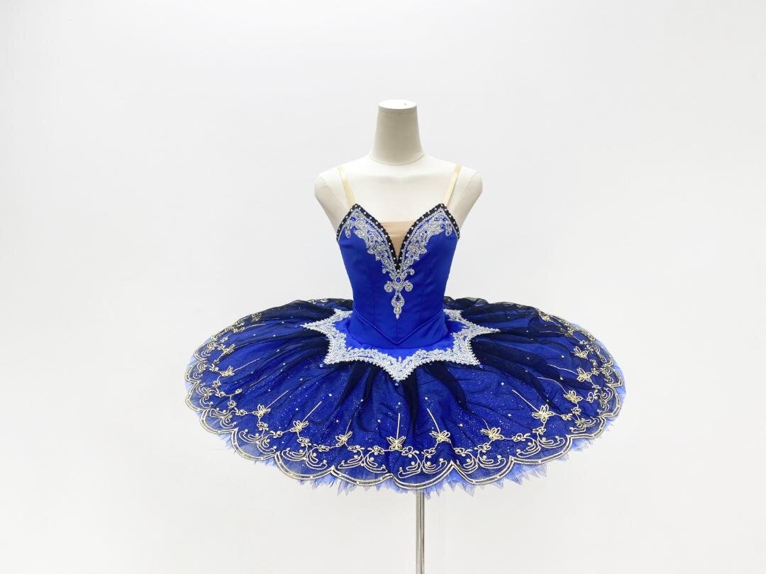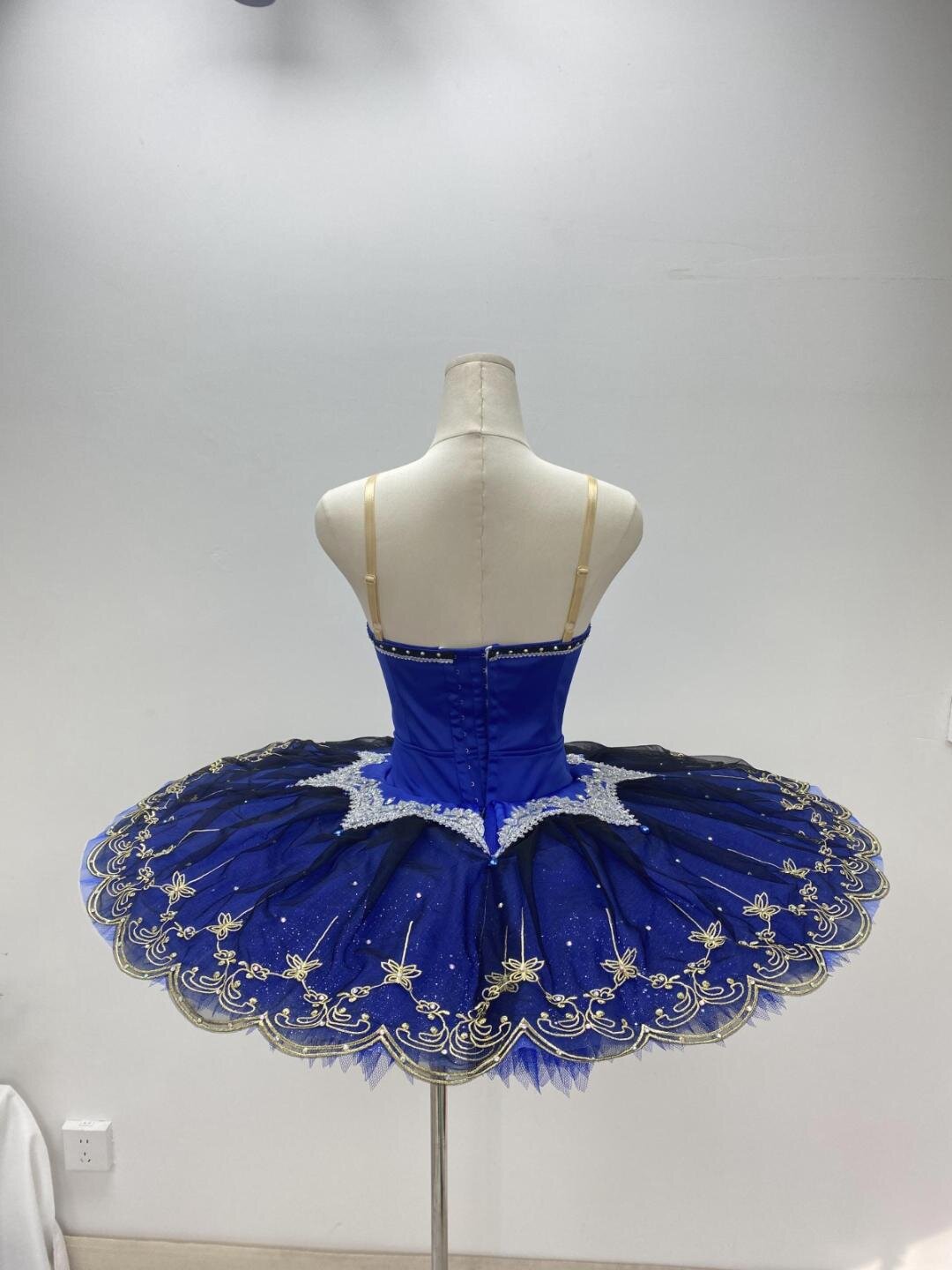This stunning blue tutu is suitable for many classical variations like Raymonda, Corsaire, the Blue Bird, and others. The tight fitted bodice is made with deep blue semi-stretchy fabric, and is decorated with silver appliques and trims, and crystals. The ten layers professional tutu skirt is made with darker blue net, and features a very rich silver and gold decoration on the edges of the tutu skirt.